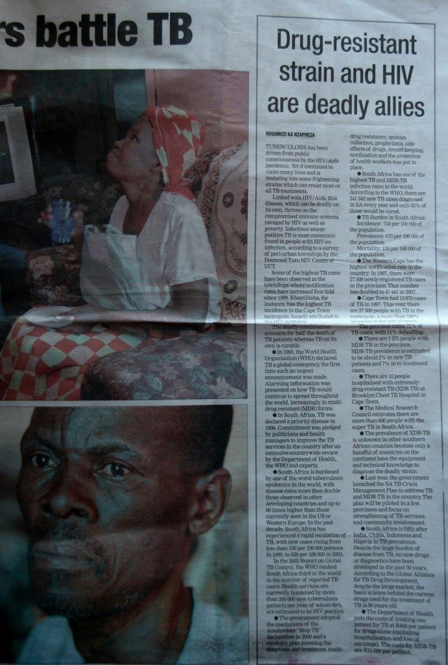 | So, everybody catches HIV, which unleashes their latent TB, which then spreads further through the township, and an entire generation is dying of "consumption", at the doorstep of some of the most beautiful scenery and expensive homes in the world. White people catch TB from their black servants and laborers (in the newspaper: a white construction mechanic caught it from his black carpenter who always wanted to sit in the cab of the truck because he was having chills), and catch HIV from sexual indiscretions too. And because so many people don't finish their TB treatment completely, the bacteria develop resistance, and now there is XDR-TB (Extreme Drug-Resistant), for which the only cure is isolation until death, just like the sanatoria of the pre-antibiotic era. Diana saw plenty of MDR- and XDR-TB, and hopefully didn't catch either of these. This is all very frightening, since Cape Town is also either the 4th or 6th most visited tourist city in the world, meaning disease can and will spread from this city at the speed of an international flight.