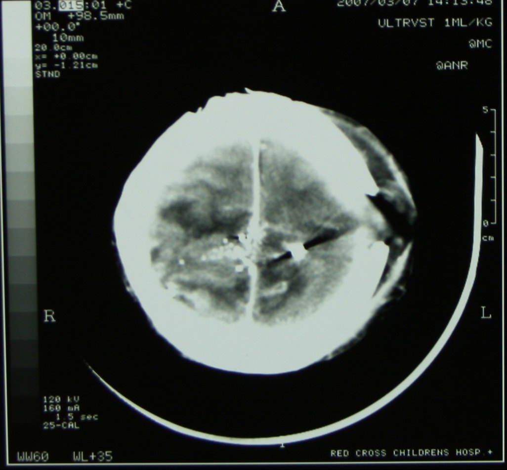 Gunshot fragments in the brain of a 4 year old boy, victim of stray bullets in a township gun battle |