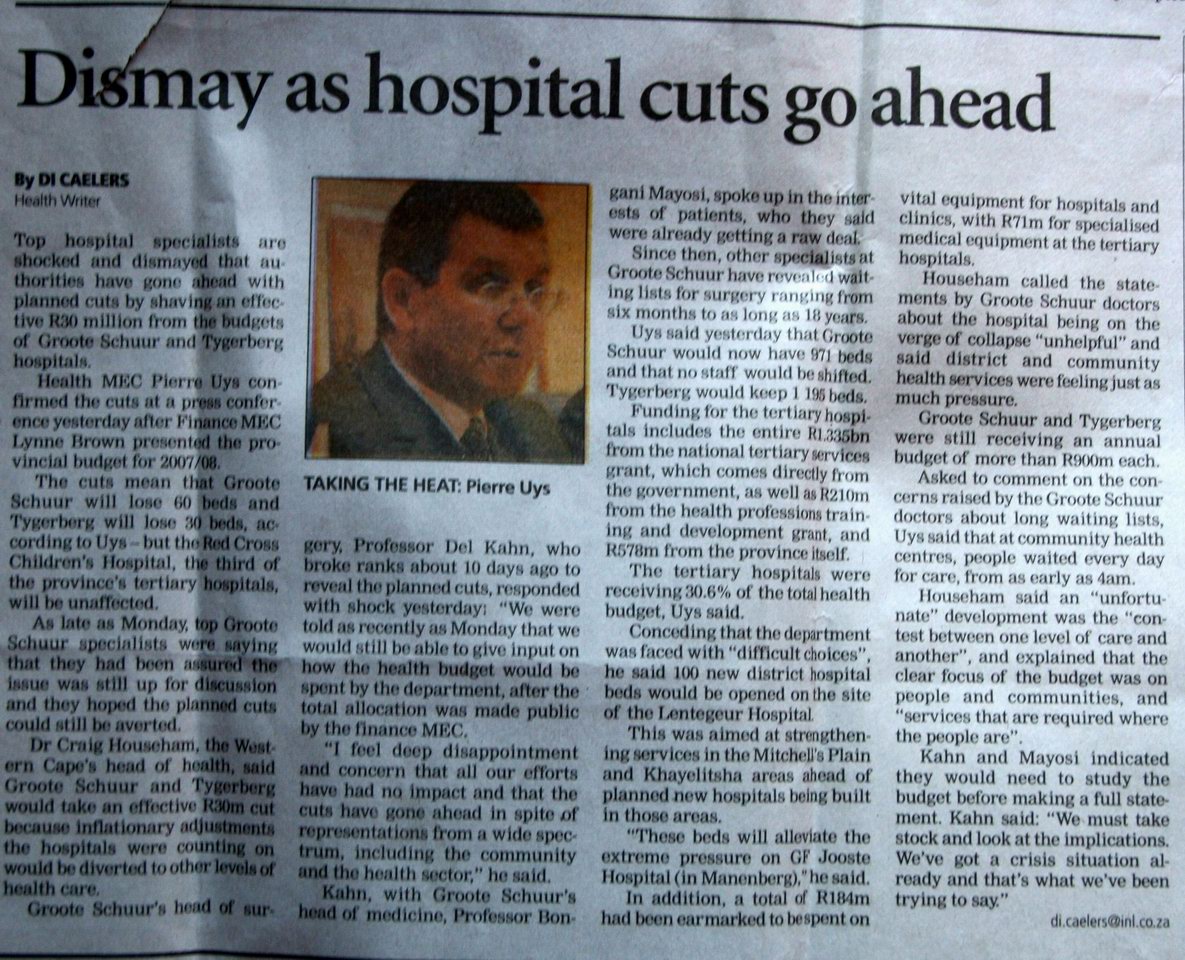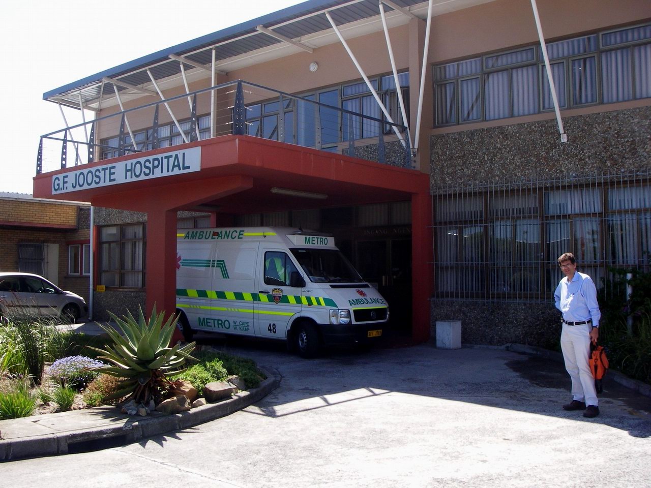 | NSH is an urban secondary hospital, whose sickest patients (those without garden-variety HIV and TB) would be sent to GSH. The largest secondary hospital in the townships is GF Jooste, which is totally overrun with patients. In a typical night on internal medicine in the main Edmonton tertiary hospital, a resident would admit 5-10 patients; at Jooste, it's 30 patients a night, many with a complex mix of HIV, TB, and side-effects from the multiple drugs being given for those diseases. Plus a wide selection of trauma. Luckily, Jooste is benefiting from government priorities, which are to "bring health care to the people" by putting resources into primary and secondary hospitals. This means Jooste, and rural hospitals like Vredenberg, 50 km from Cape Town, are getting new equipment and facilities, while the tertiary hospitals (which still serve mostly black people but which might mistakenly be thought to be serving whites since they are in white areas) are left with budget cuts despite strenuous opposition.