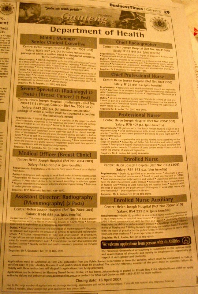 | Physicians in South Africa might go into medicine with idealistic dreams of helping the sick, then train in the public sector where they do have to do a year of community service in a rural place and then enter residency programs where as "registrars" they have the idealism systematically ground out of them by years of struggling with inadequate resources against the overwhelming mass of desperately sick patients that never stop coming through the door. Sounds rough, doesn't it; no wonder many head for private practice or even flee the country for other western nations, where these English-speaking, highly trained and experienced physicians are prized as welcome guests for much higher pay. In fact, medical students from abroad often come to South Africa for the rigorous training and intense experience, particularly in emergency medicine and surgery. As a patient, if you are penniless you get the public system, and if you have any money at all you will buy into one of the literally hundreds of private health care insurers, ranging from extremely low-rent plans which provide effectively no coverage all the way to super deluxe plans for the extremely wealthy. Private health care doesn't necessarily provide better care, as pointed out by Roal -- for at a private hospital you might be one of twenty or thirty patients under the care of one experienced internist, but his attention turns many places and he might only physically be in house once a day, meanwhile at a public teaching hospital there are interns and house officers and students and staff onsite all the time. But the private system certainly offers a deluxe experience, much in the way that the "Postnet" courier service is more pleasant than the post office -- 3x the price but shorter lineups, faster service and a general lack of those pesky black people (a feeling that hopefully fewer and fewer people are allowing themselves these days). In Groote Schuur hospital, the public radiology department on "C" floor has a 1- and 4-slice CT scanner, crowds in the waiting room ands and some quite antique X-ray equipment, while upstairs in the private department (staffed by the same radiologists on different days), there are softly carpeted floors, flat-screen LCD monitors on the computers, and nicer viewboxes. Is the diagnosis any better on the private floor? Not necessarily…although sometimes, particularly in radiology, technology is critical. Radiologists on the private side do sometimes help out the public -- for example a private clinic graciously donated scan time on a 64-slice scanner for an important CT angiogram on a child with Takayasu aortitis, since none of the public-system CT scanners were fast enough to do the scan. |