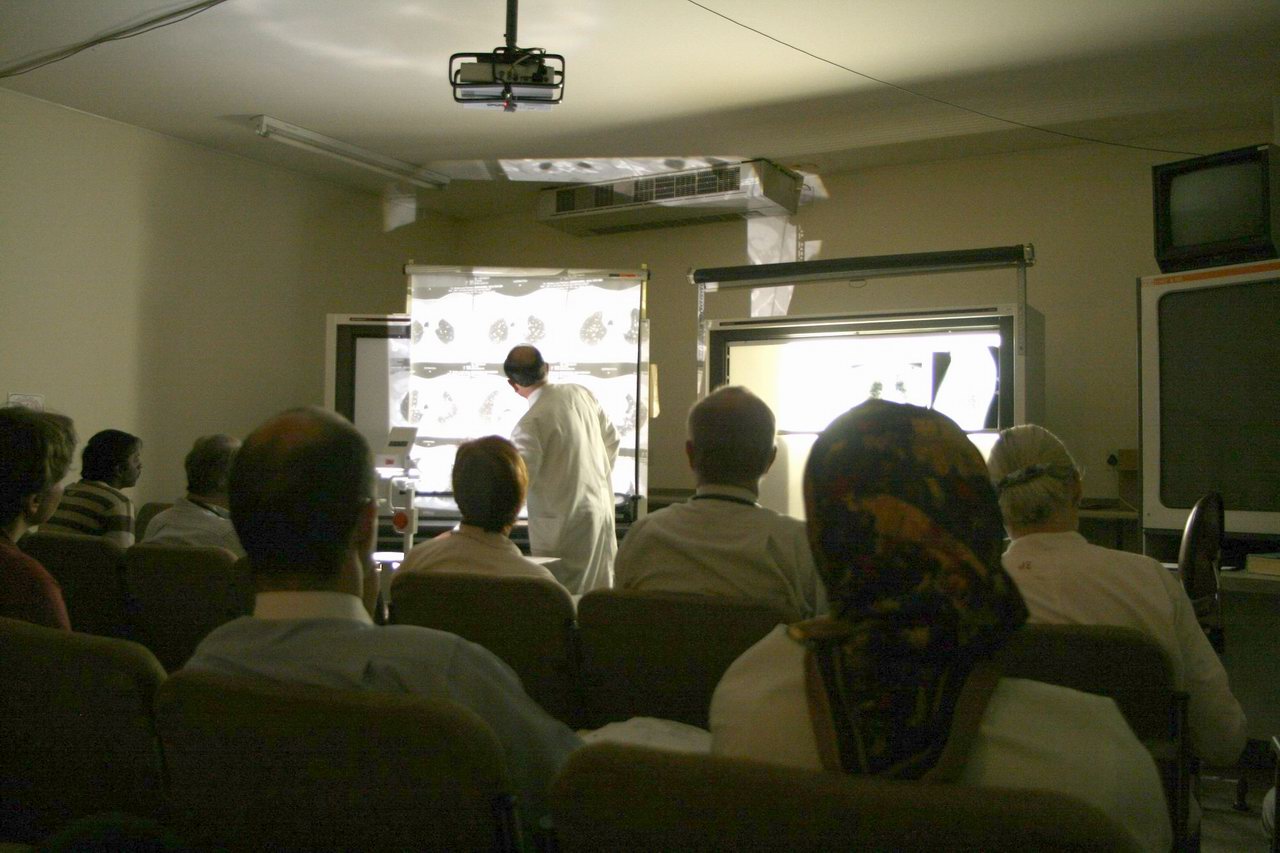 | As Qonita and I observed, it is also a pleasure to see how much we think alike as residents/registrars, despite training on the opposite sides of the world. In a sense we shone mirrors on each other's programs, and could see the strengths and weaknesses of each. For example, the Edmonton program is strong in musculoskeletal and chest radiology and nuclear medicine, while GSH is particularly strong in hepatobiliary, vascular/interventional and neuro-imaging. The GSH group is currently struggling with the loss of several specialist consultants but coping remarkably well, and (for the moment) the training remains as good as what I have seen in Canada. The residents (registrars) at GSH have a great deal of clinical experience, as they have a more demanding call roster than we do and I think a higher volume of cases, particularly X-rays. They are good at taking responsibility, since they don't review all cases with their consultants but only the ones they find difficult or uncertain. This is intimidating at first -- if you miss something on an X-ray and are confident it is normal, no one else will ever look at it. Back in Canada, a staff radiologist also looks at the cases that are done, so it's more relaxing for the resident -- you feel that at least if you miss it, someone else will catch it. But I think a senior resident benefits from this (after all, if I pass my exams in a year I will be the only one looking at almost all the cases). It forces one to think about what abnormalities are likely to be important and those which are not.