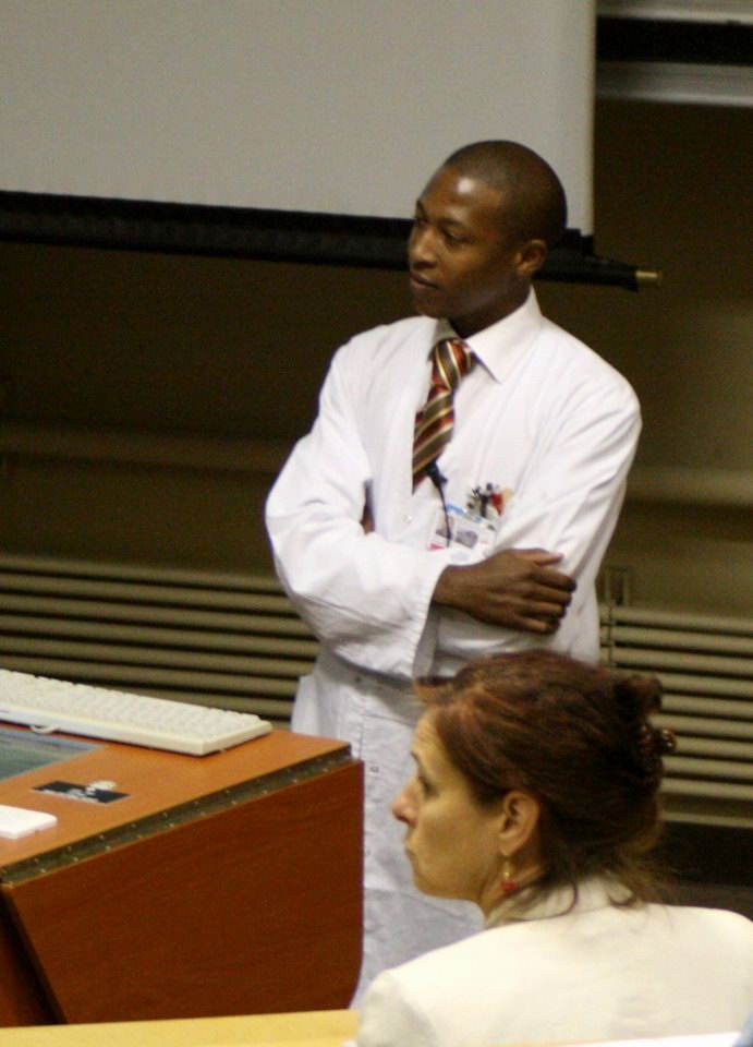 Dr. Ntusi gives a talk. That's Dr. Sally Candy, neuroradiologist, watching in front. |