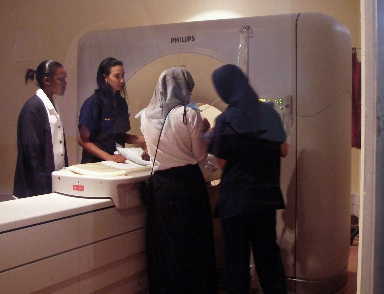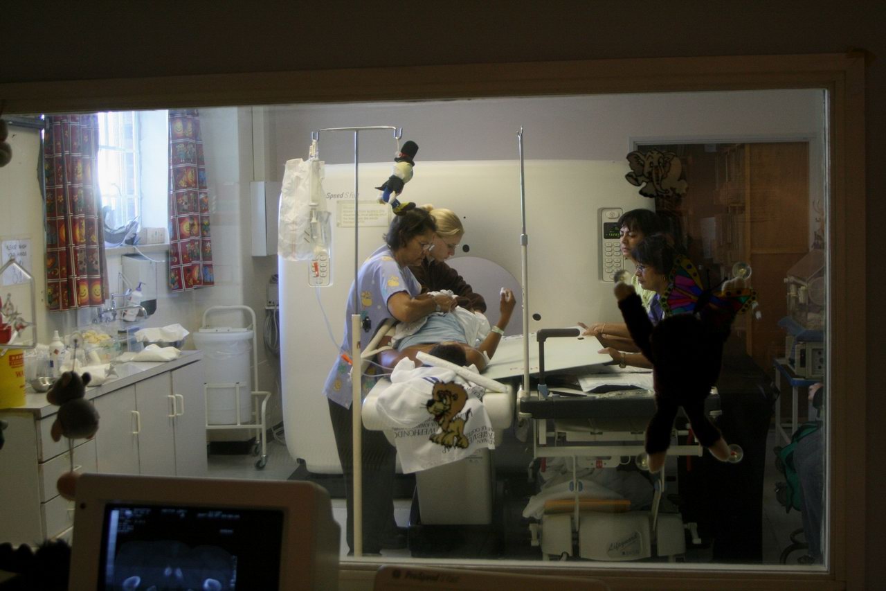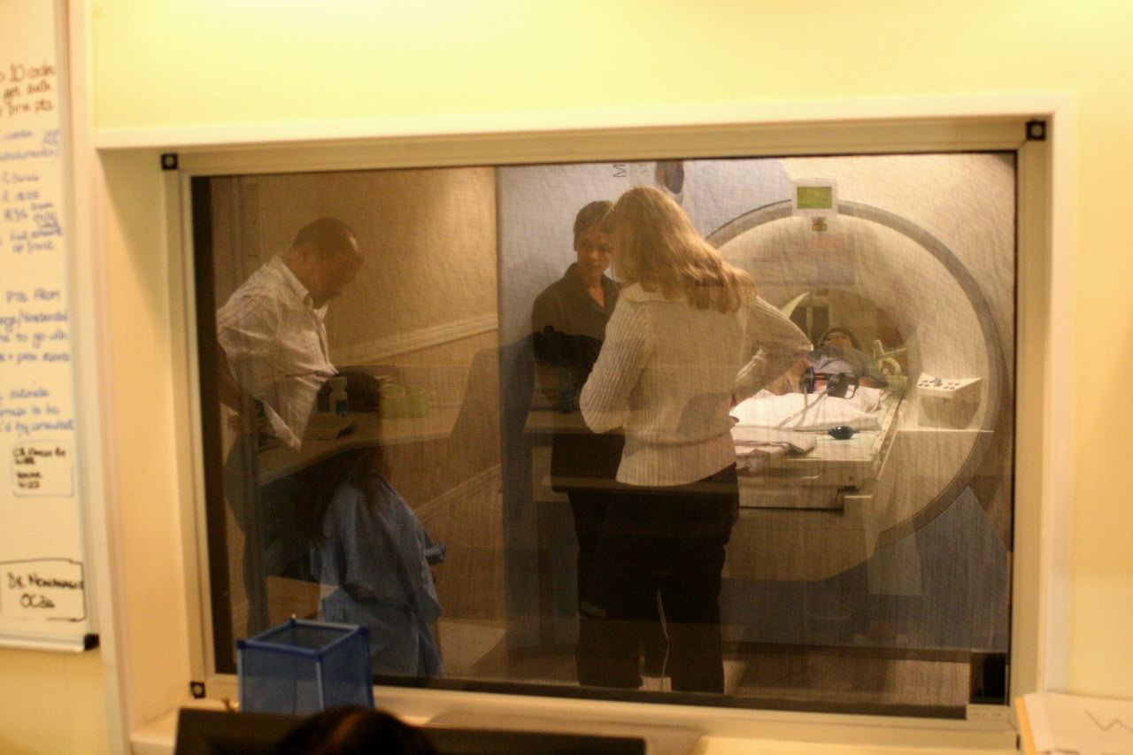 The standing girl was shy to get in the MRI; the boy lying in the machine is doing it to demonstrate to the girl how easy it is! She still refused to enter. |