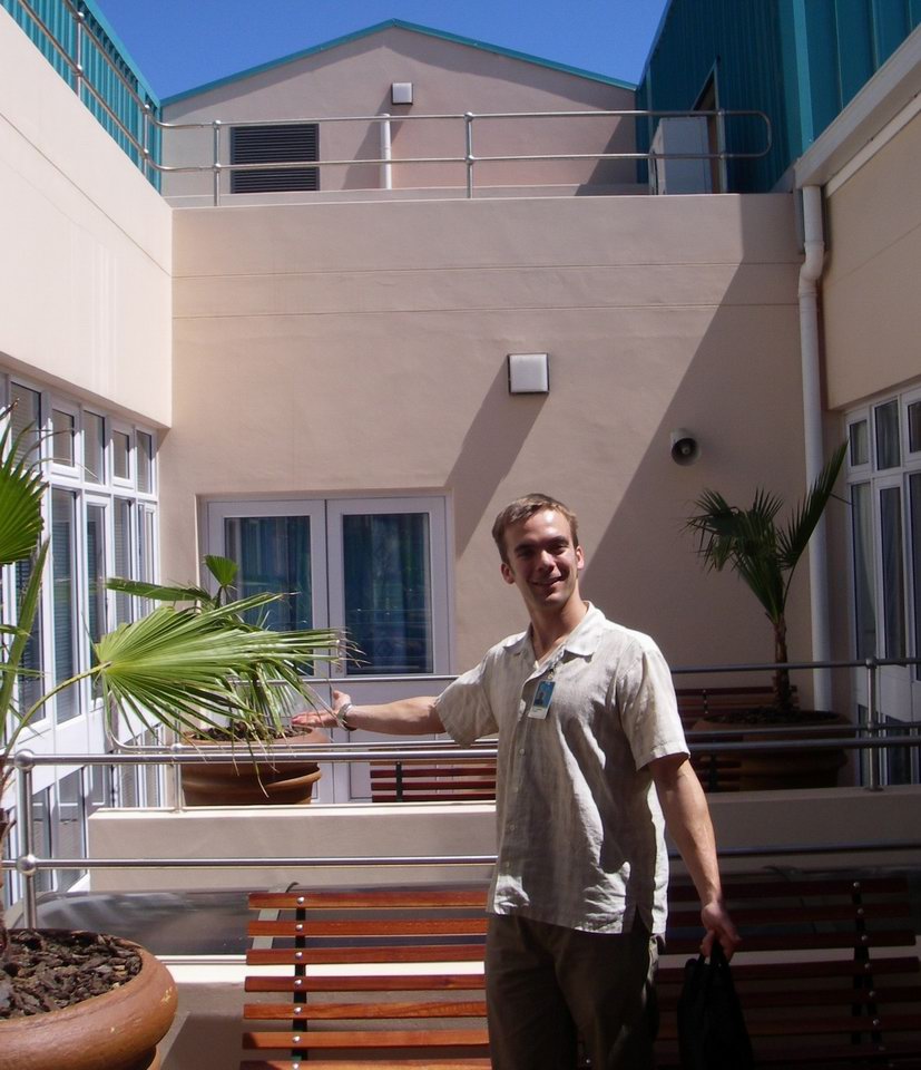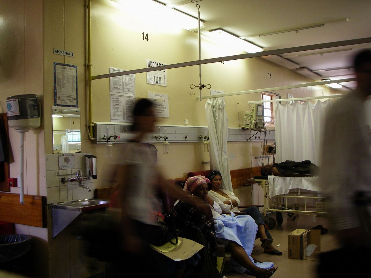 | Diana's hospital, New Somerset Hospital (NSH), is next to the Waterfront, a vast tourist development of expensive restaurants, tony shops and an Imax theatre at the harbor surrounded by $400+/night hotels. The original yellow building is not in much use, and in fact a recent sweep was done to kick out the many vagrants who had started living in its corners and attics. The newer concrete monolith that is the actual hospital serves a mix of poor white and black people, with a triage area resembling a large jail cell -- gates bar the way into the E.R., manned by security guards aiming to prevent gangs from finishing off the job on wounded assault victims. Nearly everyone at NSH has tuberculosis -- Diana's medicine team admitted ~12 patients per night and 10-11 of these would have TB, most also with HIV. Most people deny that they are HIV positive, or say they "don't know", because of the social stigma associated with it. The polite euphemism for the medical charts is "RVD+" (RetroViral Disease). So overwhelming is the burden of TB that there is essentially no isolation -- a patient with multi-drug-resistant TB (MDR-TB), who in Canada would be isolated in a room with negative pressure ventilation drawing air carefully through a safe path and examined by a team wearing special masks, gowns and gloves, in South Africa is probably in a common ward room with 6 other patients and the medical staff don't even bother with masks. But relax, almost everyone else in the room has TB already. A sample of the fluid building up beside the lungs is drawn from a large needle placed with virtually no precautions, just an alcohol swab on the skin.