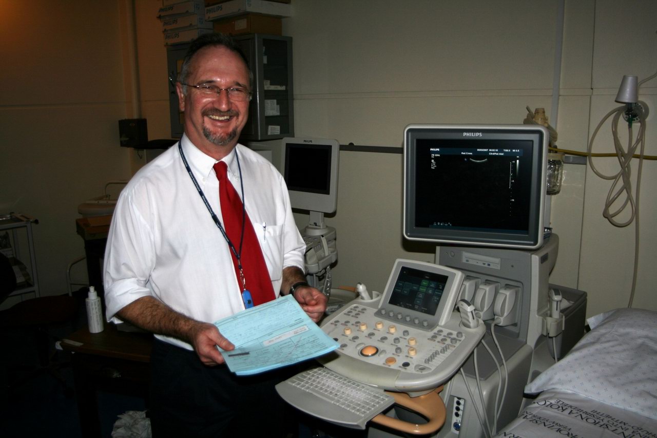 Dr. Dick Pitcher shows off the beautiful new Philips ultrasound machine, same as we have at home in Edmonton |