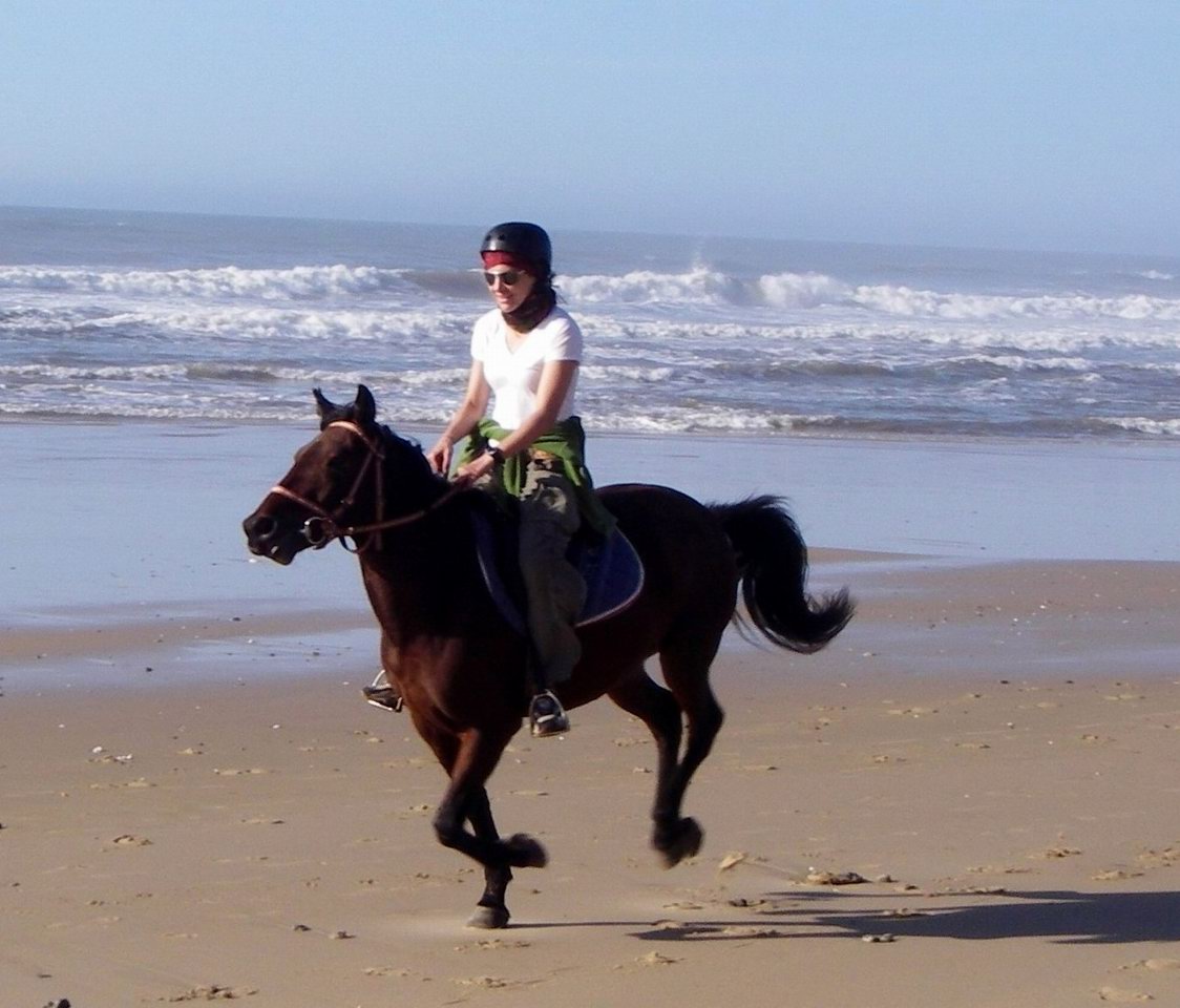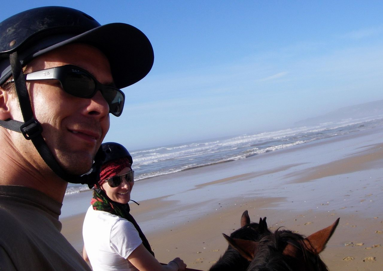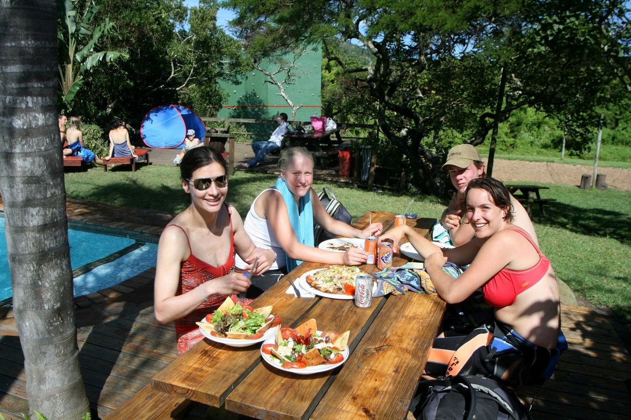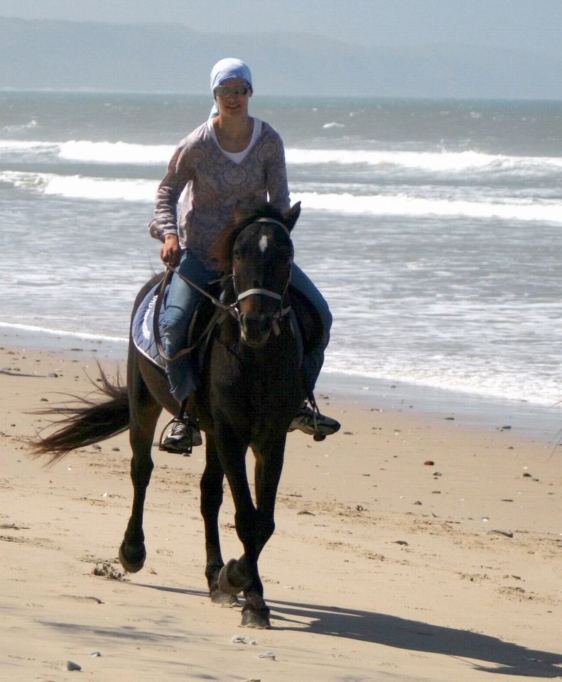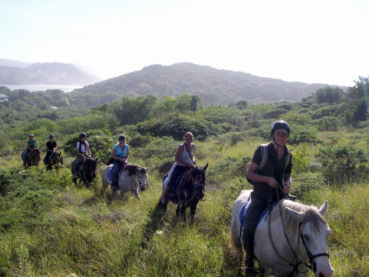 | Further east, the vast "Transkei" area, previously a large black "homeland", is a different place entirely. Hills are covered with small black-owned farms, and for hundreds of kilometers the road is filled with pedestrians and stray animals, the worst being the completely unpredictable goats. You would think it would make economic sense for even the poorest farmer to put up simple fences to keep his stock from becoming roadkill or moving to other people's farms. It would certainly be safer for drivers! The terrain is rugged, with the N2 highway climbing and descending multiple dramatic mountain passes. Packed minibus taxis passing overloaded trucks uphill on blind corners adds to the excitement. This was like visiting another country, more like Thailand, India or Vietnam than the rest of South Africa in terms of wealth and development. Just as rapeseed oil was cleverly renamed canola oil to improve sales, this area has been re-branded as the "Wild Coast" for tourism and you won't find the dreaded "Transkei" name on any modern map. Even the hostels are more rustic and wild out here -- at Cintsa we stayed in a gorgeous spot called Buccaneer's Backpackers, which has been in operation since 1983, ie., during apartheid. Great place except the state of hygiene is among the worst of anywhere we ever stayed, ants filling the sugarbowls (it's not the ants that bother me, it's the thought of scooping their feces into my tea) and 4-5 mm beetle-like insects roaming the beds, giving Diana the worst case of 'bedbugs' we can remember. The beachside horseback riding, including expert training in how to trot and canter, was fantastic though, and our stay was relaxing despite the itches.