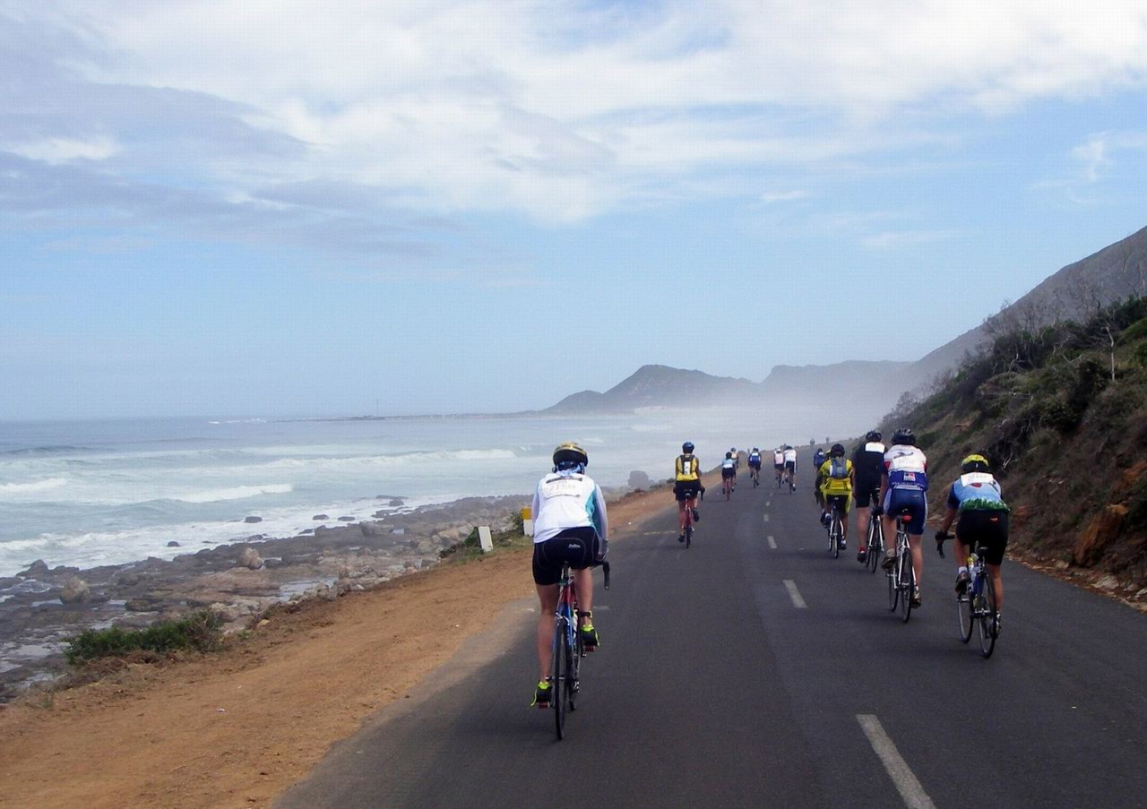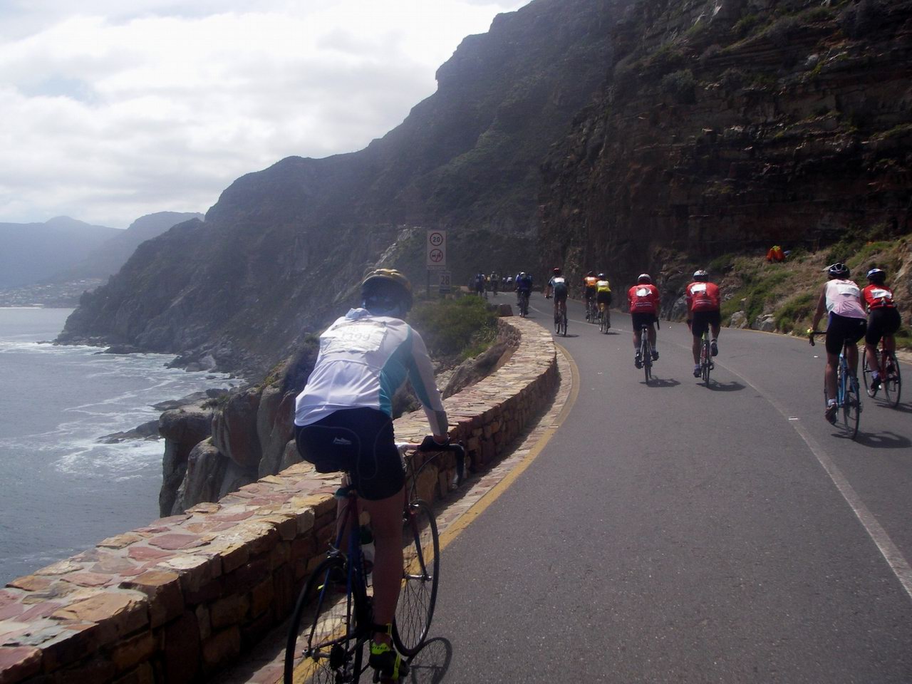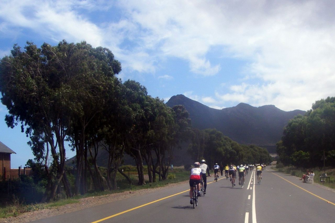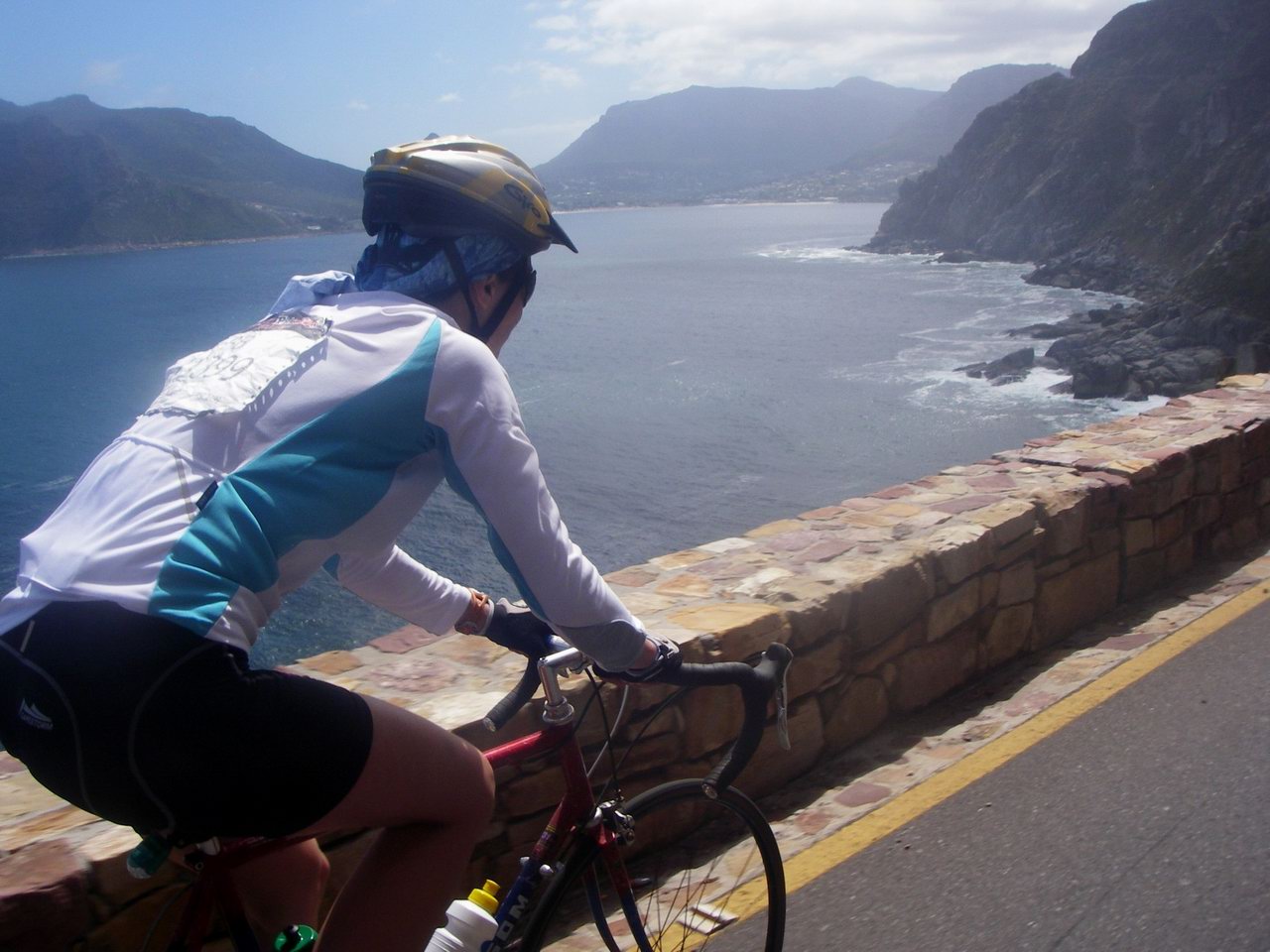 | The first phase of our road trip was, in a sense, aboard bicycles. Roal, Jean and their son Richard outfitted us with all the gear to do the Cape Argus Cycle Tour, the world's largest timed bicycle race, with 40,000 participants. Start times for the 109 km loop around the Cape of Good Hope were staggered by skill level, as measured in previous timed races, with the fastest going first (and some, just to show off, repeating the loop with the slower people who start 3 hours later). As international entrants we were placed near the middle. The gorgeous route includes the road to Muizenberg almost to Cape Point, then turns past Misty Cliffs (our favorite) and up along the Chapman's Peak road -- the longest and steepest hill, carved into the mountain and recently rebuilt from major collapse in rockslides a few years ago. The worst hill is Suikerbossie, only moderately long and steep but coming late in the race when it is hot and you are tired from Chapman's Peak. My mountain bike was slow in the downhills even with slicks and Diana wished she had a third chainring on her road bike for the uphills, but we were proud of ourselves for our 4 h 19 minute finish. This was ~16,000th place! If we lived in Cape Town we would do the race annually -- in a place where there is really only one season, endless summer, the Argus is a way of marking the years. Maybe in 10 or 20 years there will be many black participants -- this race was almost entirely white, and at times there was a bit of an awkward feeling as we realized we were part of a parade of white people riding on expensive bicycles past black spectators in a race where the entrance fee (400 rand or $65) is 15 days pay for many blacks working at minimum wage. Plenty of police were watching the race, not just out of curiosity...