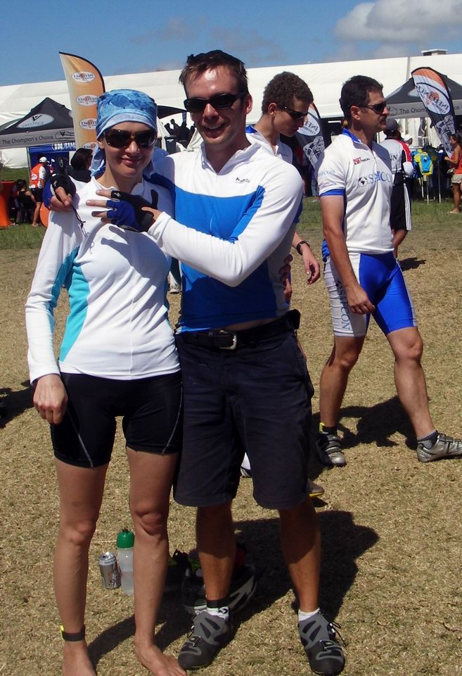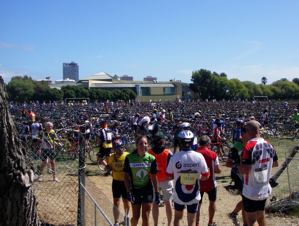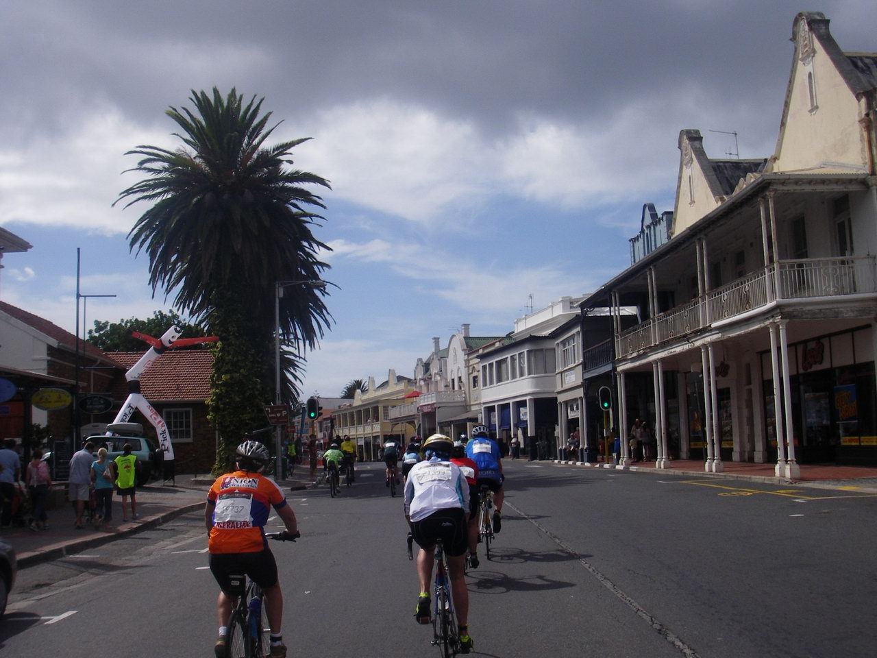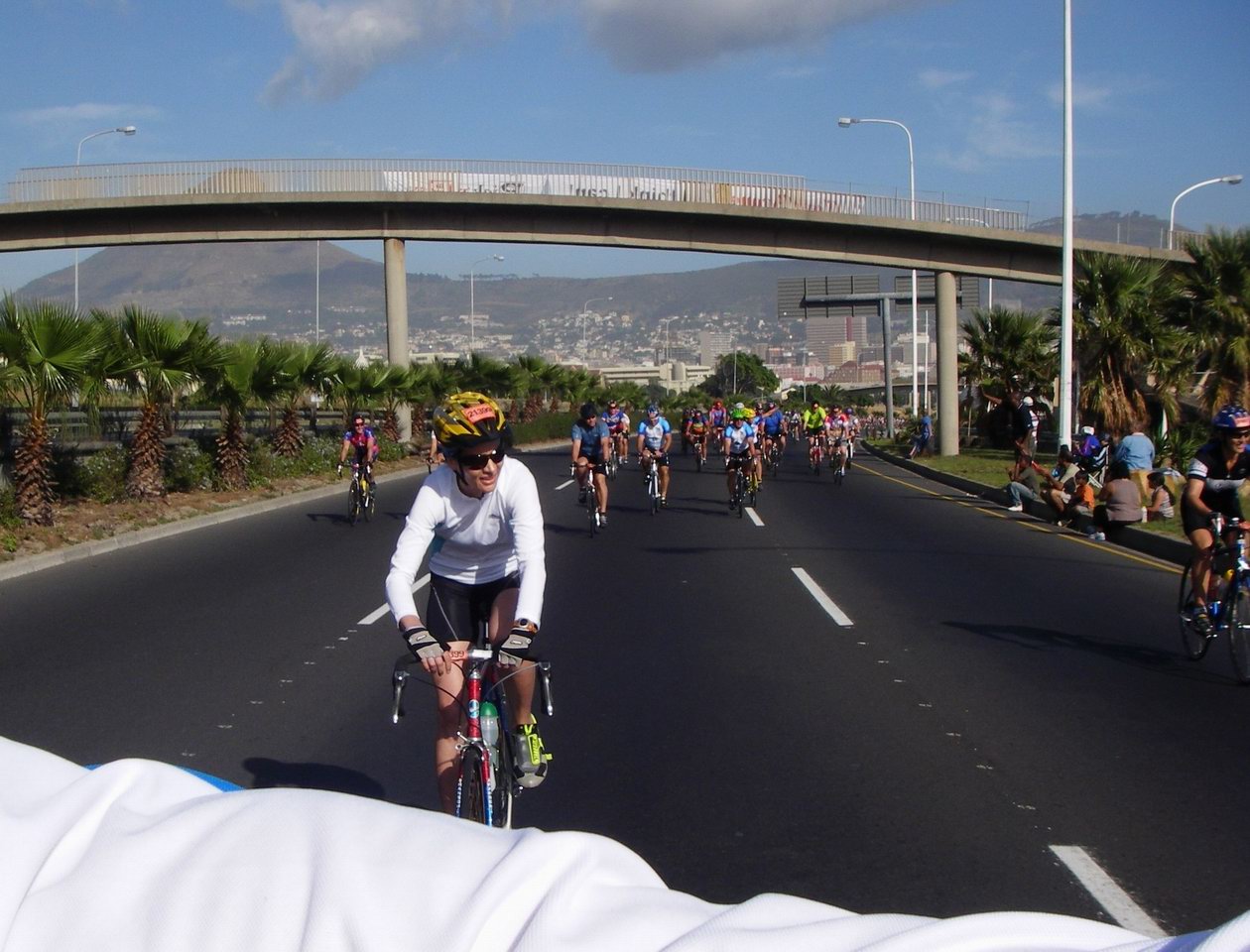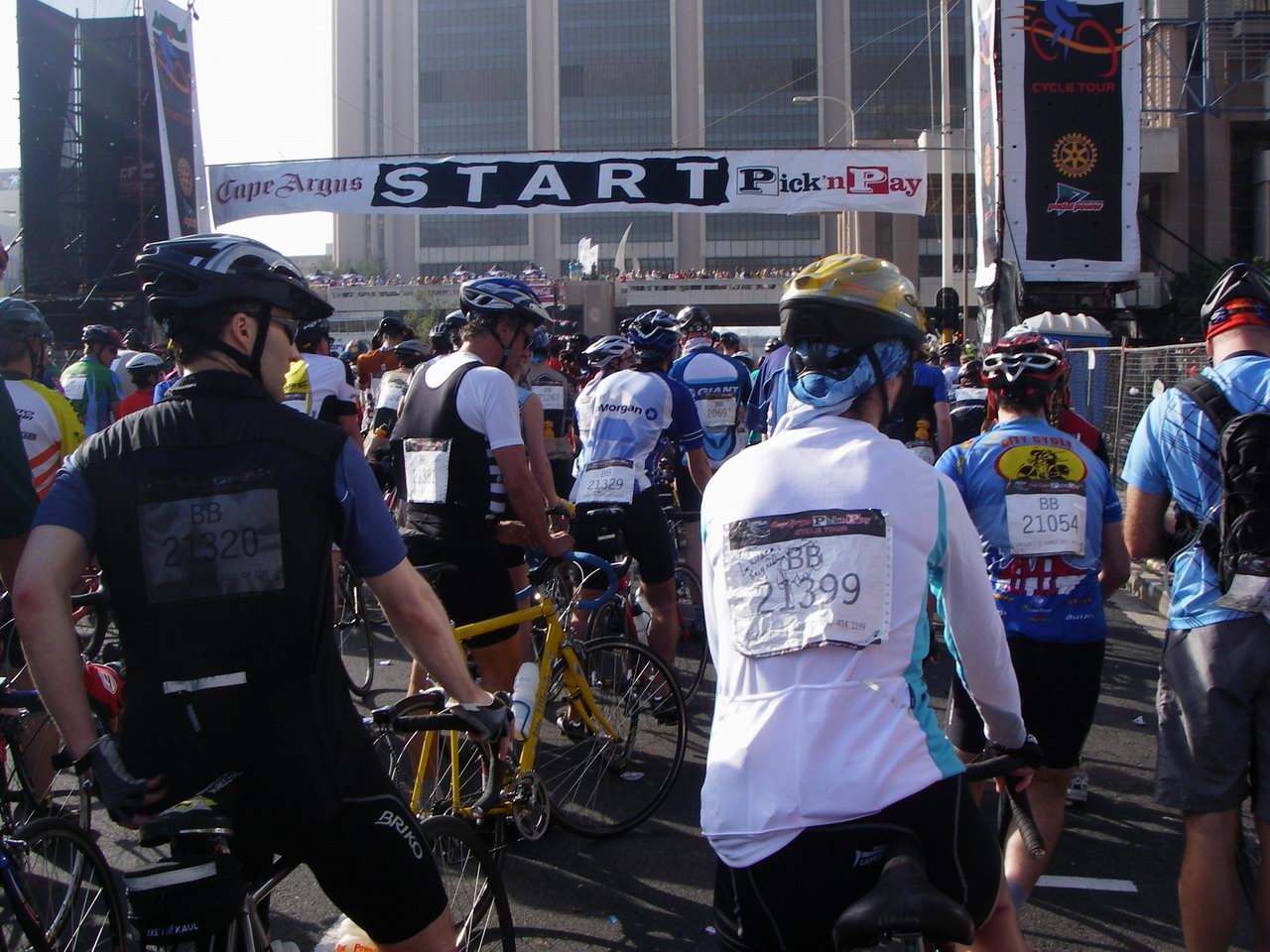 | The first phase of our road trip was, in a sense, aboard bicycles. Roal, Jean and their son Richard outfitted us with all the gear to do the Cape Argus Cycle Tour, the world's largest timed bicycle race, with 40,000 participants. Start times for the 109 km loop around the Cape of Good Hope were staggered by skill level, as measured in previous timed races, with the fastest going first (and some, just to show off, repeating the loop with the slower people who start 3 hours later). As international entrants we were placed near the middle. The gorgeous route includes the road to Muizenberg almost to Cape Point, then turns past Misty Cliffs (our favorite) and up along the Chapman's Peak road -- the longest and steepest hill, carved into the mountain and recently rebuilt from major collapse in rockslides a few years ago. The worst hill is Suikerbossie, only moderately long and steep but coming late in the race when it is hot and you are tired from Chapman's Peak. My mountain bike was slow in the downhills even with slicks and Diana wished she had a third chainring on her road bike for the uphills, but we were proud of ourselves for our 4 h 19 minute finish. This was ~16,000th place! If we lived in Cape Town we would do the race annually -- in a place where there is really only one season, endless summer, the Argus is a way of marking the years. Maybe in 10 or 20 years there will be many black participants -- this race was almost entirely white, and at times there was a bit of an awkward feeling as we realized we were part of a parade of white people riding on expensive bicycles past black spectators in a race where the entrance fee (400 rand or $65) is 15 days pay for many blacks working at minimum wage. Plenty of police were watching the race, not just out of curiosity...