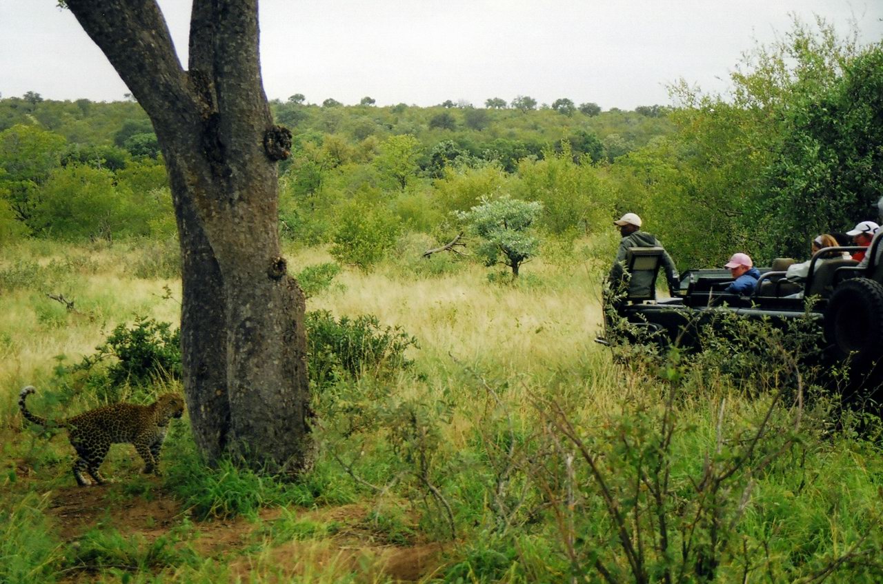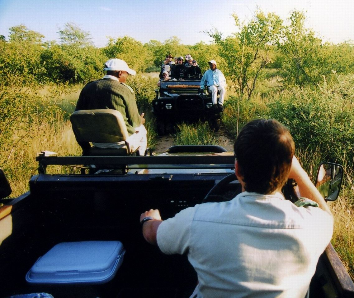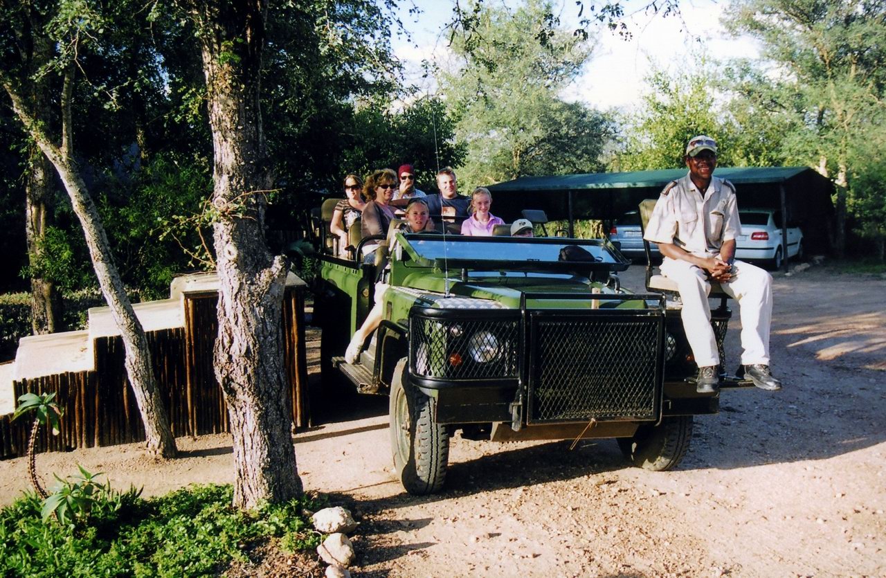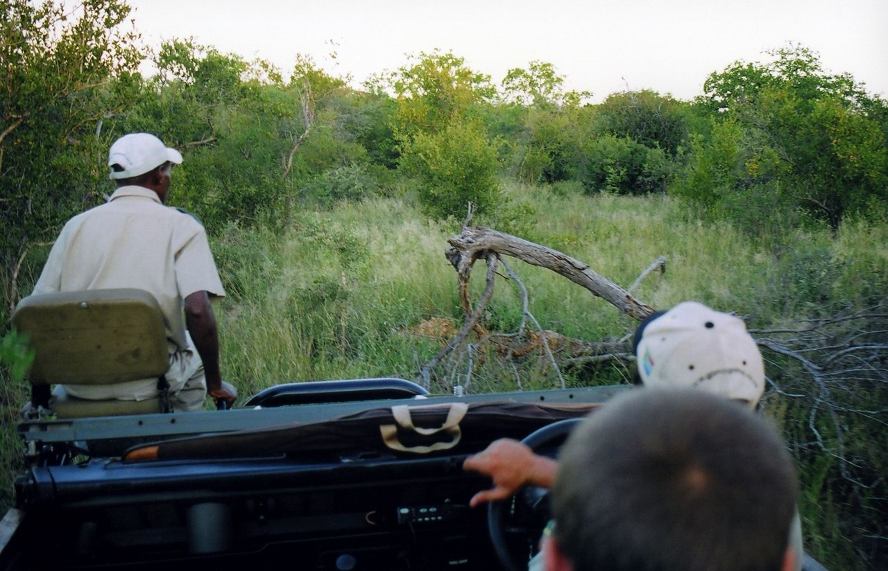 | Both safari lodges we stayed at were in Timbavati private game park, which is a huge tract of land just west of the Kruger National Park with no internal fences, so the game roam freely. Within Timbavati there are at least a dozen private lodges such as Akeru or Gomo Gomo, each owning a portion (Akeru = ~2000 ha, G.G. = ~12000 ha). The guests at each lodge go for game drives on 10-passenger open Land Rovers, with a ranger with a rifle and a radio, and often a local bush tracker in front, to see animals. Unlike in the national parks, the rangers know where the animals tend to go, the trackers can find them in the bush with amazing skill, and the rangers are allowed to go off-road, using the heavily fortified front end of the Land Rover to bushwhack, knocking over trees up to 10-12 feet high in pursuit of big game. This sounds terrible but the effect of the Land Rover is probably comparable to two rhinos or three elephants walking the same path -- those beasts are very destructive.