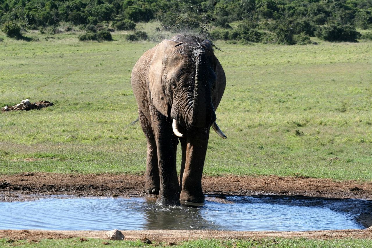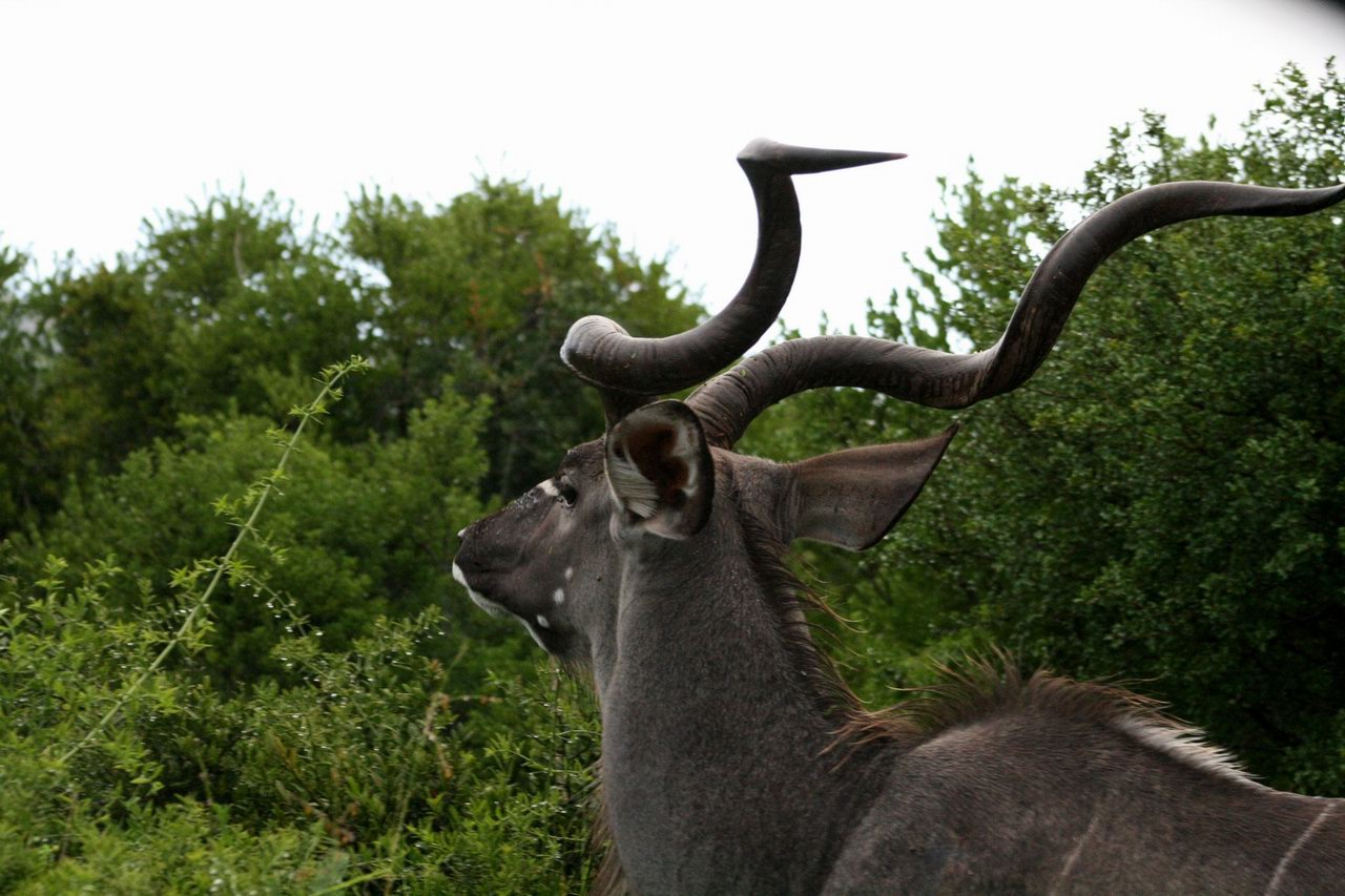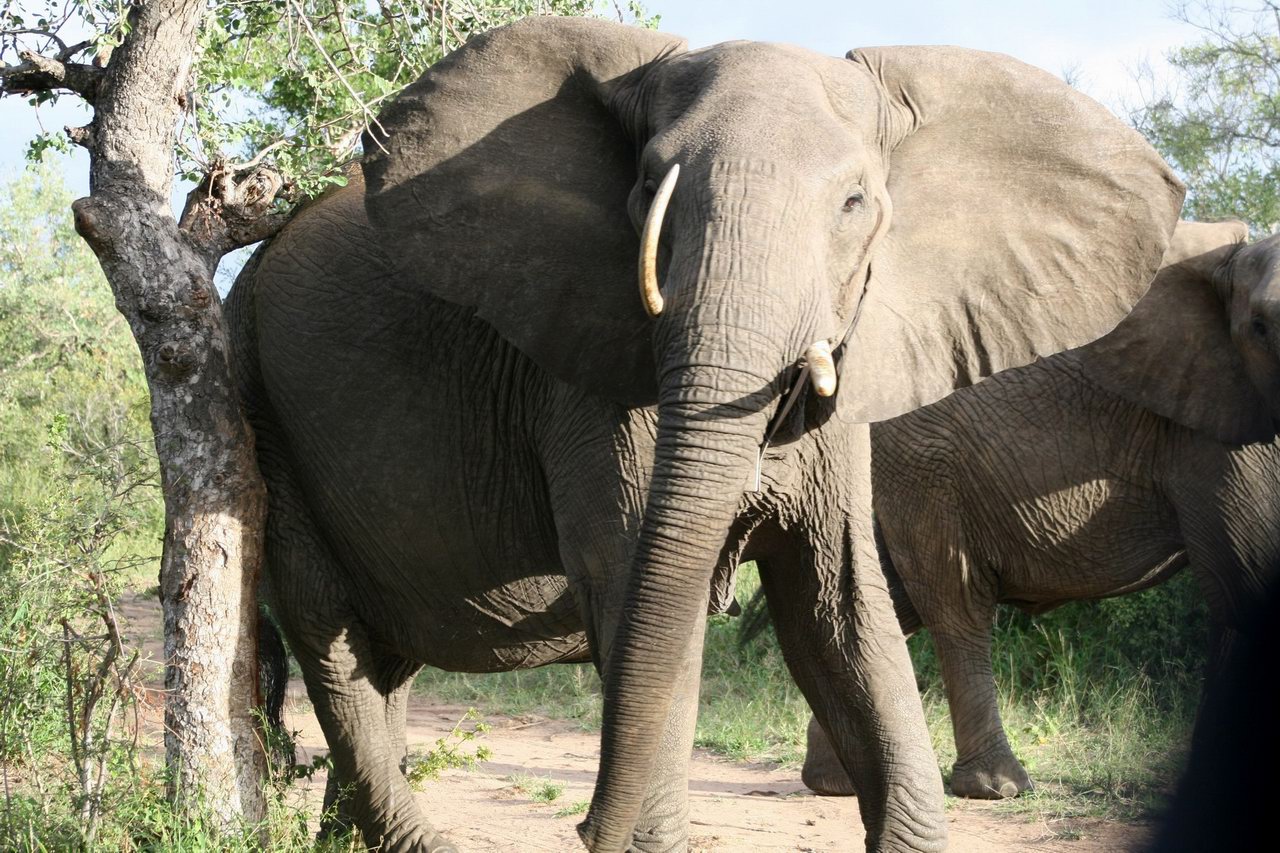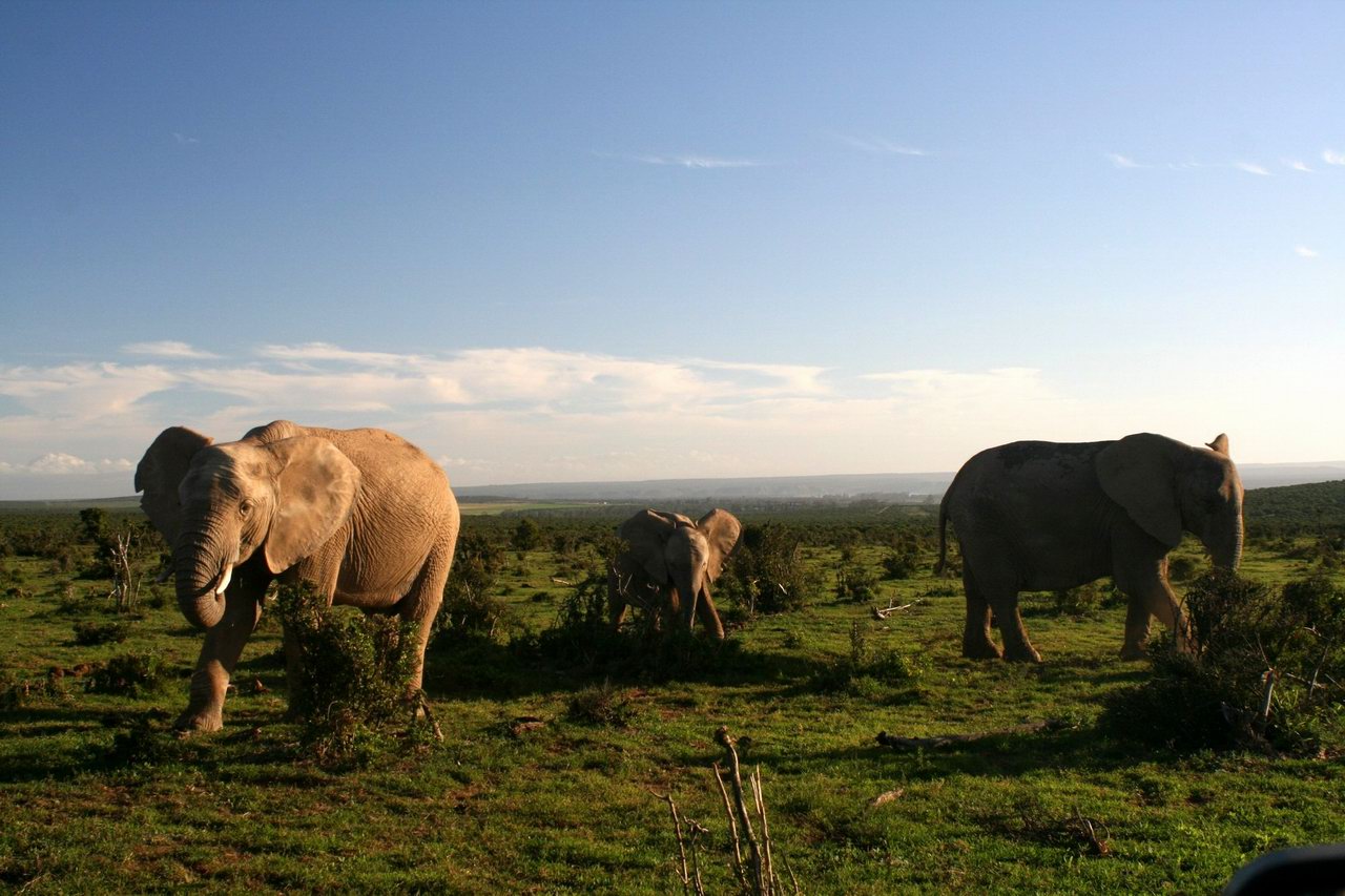 | The unique joy of a trip to Africa is a big-game safari. Once for the adventurous who would go into the wilderness for months tracking big game to shoot, a modern safari is as sedentary and easy to do as an ocean cruise. And very costly. At South Africa's national parks, the elephants, lions etc. roam free. You are able to drive around in the vast parks on paved or gravel roads, looking for animals, for just $30 per person per day, with chalets running about $100 a night. If you do it this way, as we did in Addo Elephant Park, you will definitely see wildlife -- deer, elephants, giraffes. But you would have to be very lucky to see a carnivore this way, and you will surely destroy your rental car if the roads are gravel. Still, at least this gets you into the park at a reasonable cost. If you can splurge, costs are from $225 per person per night at the cheapest private lodge (with electricity, ensuite bathroom with hot shower, 3 meals a day and two 3-hour drives near sunrise and sunset). For better food and deluxe lodgings, the price can easily quadruple before you even blink. Still, after nearly two months of being cheap, we "splashed out" and had a 4 night safari.