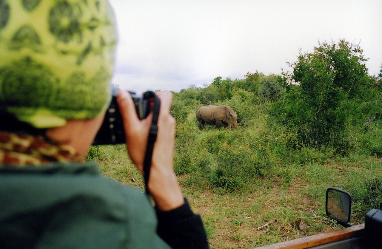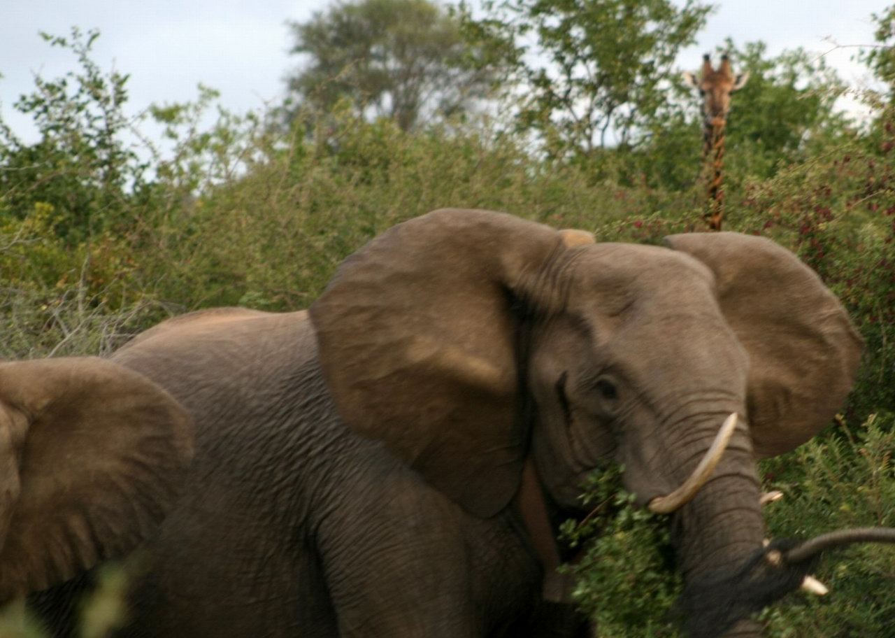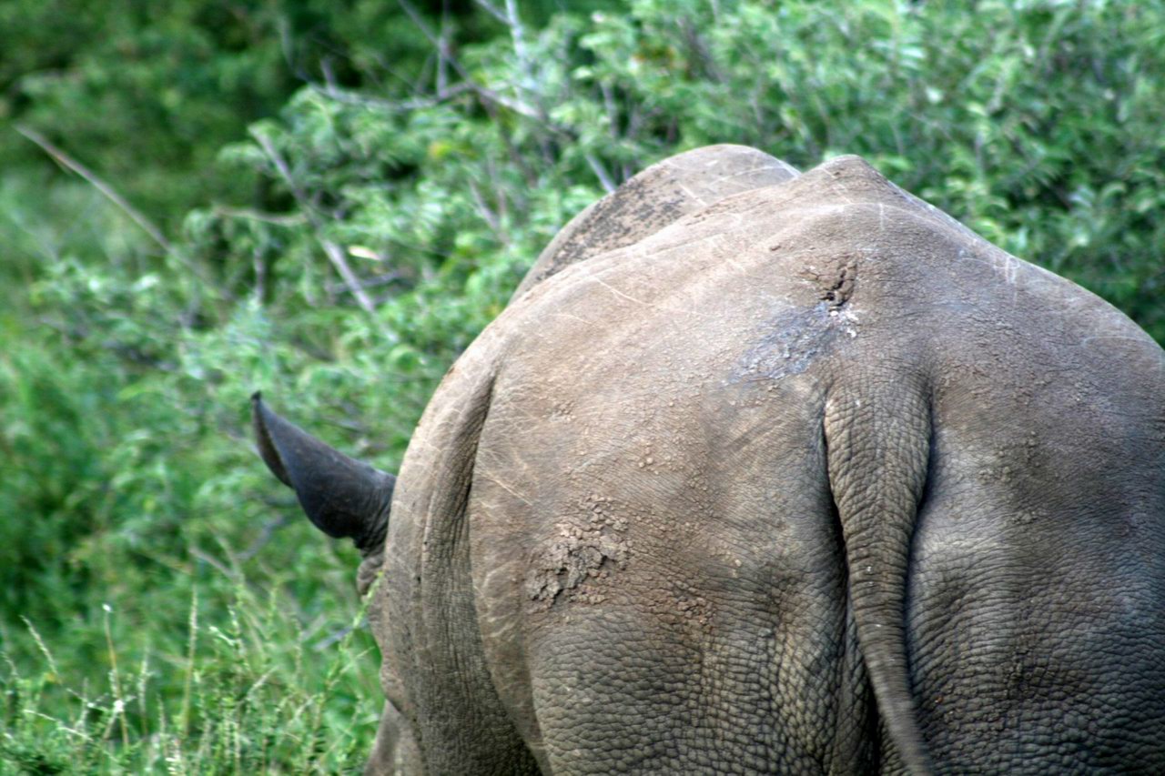 | At Gomo Gomo, our Land Rover full of happy tourists was racing through the brush in hot pursuit of a fresh rhino sighting, everyone talking animatedly and laughing -- then suddenly as we rounded a sharp corner, we found ourselves against a riverbank, separating a herd of probably 15 elephants from their matriarch. She angrily trumpeted and stamped around in a quite intimidating display, and the rest of the elephants faced us in a solid wall of grey flesh -- quite unnerving and we wondered just what we had gotten ourselves into. Nothing to do but wait for them to calm down, and luckily the matriarch then got a strong urge to itch her flank, nearly knocking over a 20 foot tree in her enthusiastic scratching. Hilariously, a giraffe poked her curious head over the treetops, no doubt wondering what all the trumpeting was about. The elephants eventually wandered off, quite slowly, and we resumed our rhino pursuit. This rhino was also upset (tensions running high in that part of the forest!) and had just charged the last Land Rover to drop by, and apparently charged the next one after we left, but he just ignored us. The animals must want to be left in peace. Life is much better for the animals on a game park than the zoo -- they get to roam hundreds of square kilometers and live life nearly the way they would have done in the wild before, free of hunting and free to roam. The price they pay is putting up with the Land Rovers from 6-9 AM and 3-6 PM, on the days when they are unlucky enough to be spotted or tracked. They can hide and evade the humans too. Our best rhino sighting was actually two of them in an inaccessible field near the park perimeter fence as we roared away at 120 km/h on our way to the airport.