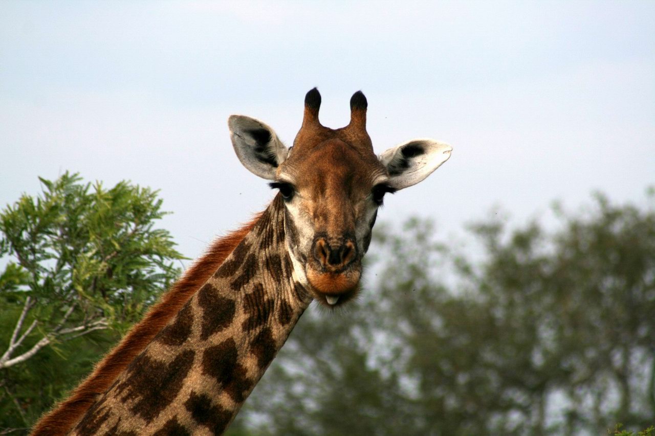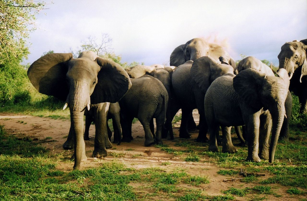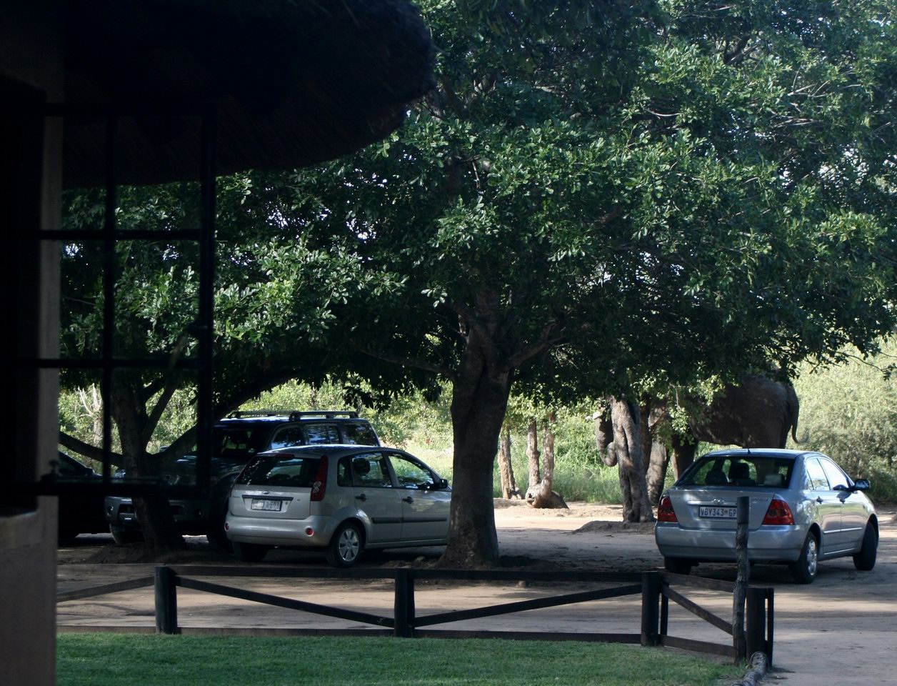 | At Gomo Gomo, our Land Rover full of happy tourists was racing through the brush in hot pursuit of a fresh rhino sighting, everyone talking animatedly and laughing -- then suddenly as we rounded a sharp corner, we found ourselves against a riverbank, separating a herd of probably 15 elephants from their matriarch. She angrily trumpeted and stamped around in a quite intimidating display, and the rest of the elephants faced us in a solid wall of grey flesh -- quite unnerving and we wondered just what we had gotten ourselves into. Nothing to do but wait for them to calm down, and luckily the matriarch then got a strong urge to itch her flank, nearly knocking over a 20 foot tree in her enthusiastic scratching. Hilariously, a giraffe poked her curious head over the treetops, no doubt wondering what all the trumpeting was about. The elephants eventually wandered off, quite slowly, and we resumed our rhino pursuit. This rhino was also upset (tensions running high in that part of the forest!) and had just charged the last Land Rover to drop by, and apparently charged the next one after we left, but he just ignored us. The animals must want to be left in peace. Life is much better for the animals on a game park than the zoo -- they get to roam hundreds of square kilometers and live life nearly the way they would have done in the wild before, free of hunting and free to roam. The price they pay is putting up with the Land Rovers from 6-9 AM and 3-6 PM, on the days when they are unlucky enough to be spotted or tracked. They can hide and evade the humans too. Our best rhino sighting was actually two of them in an inaccessible field near the park perimeter fence as we roared away at 120 km/h on our way to the airport.
