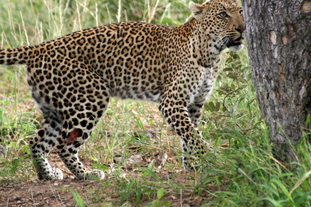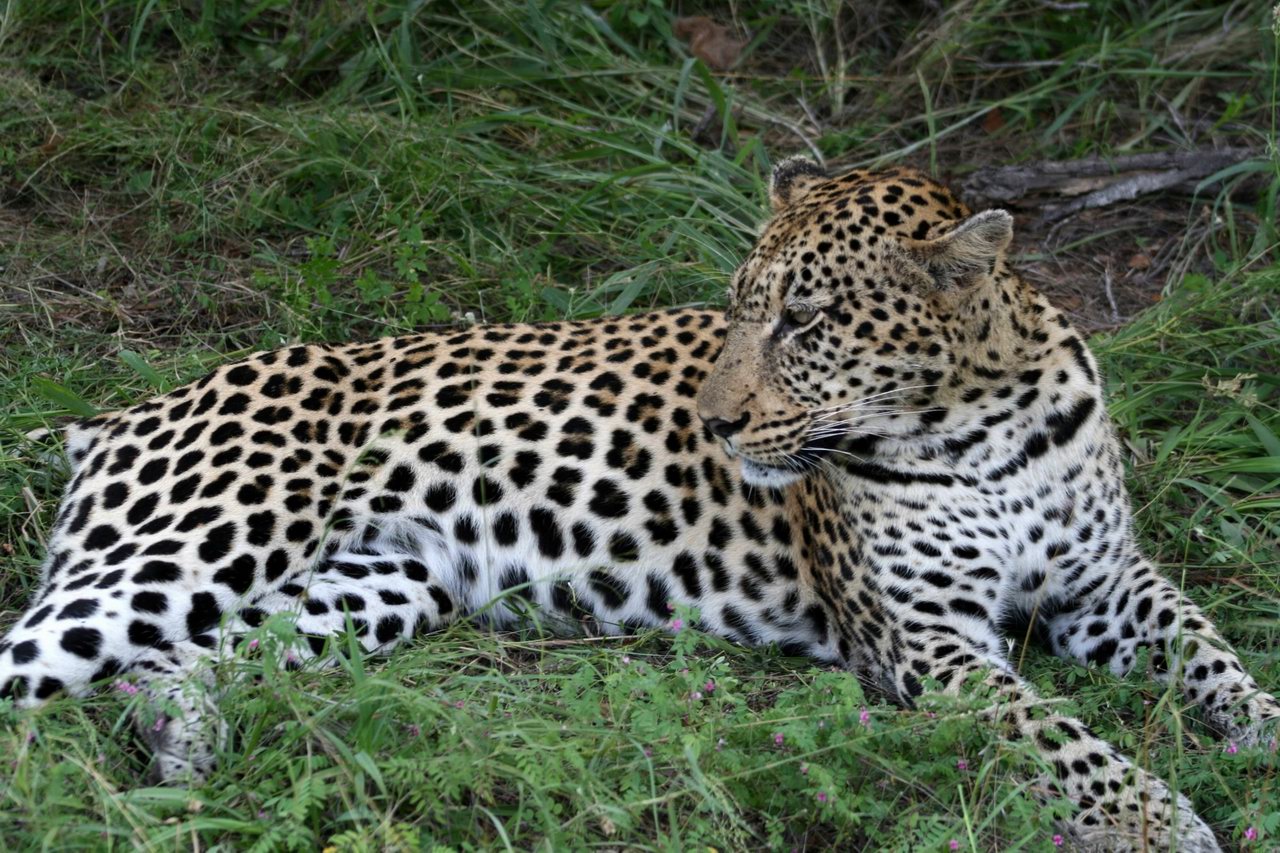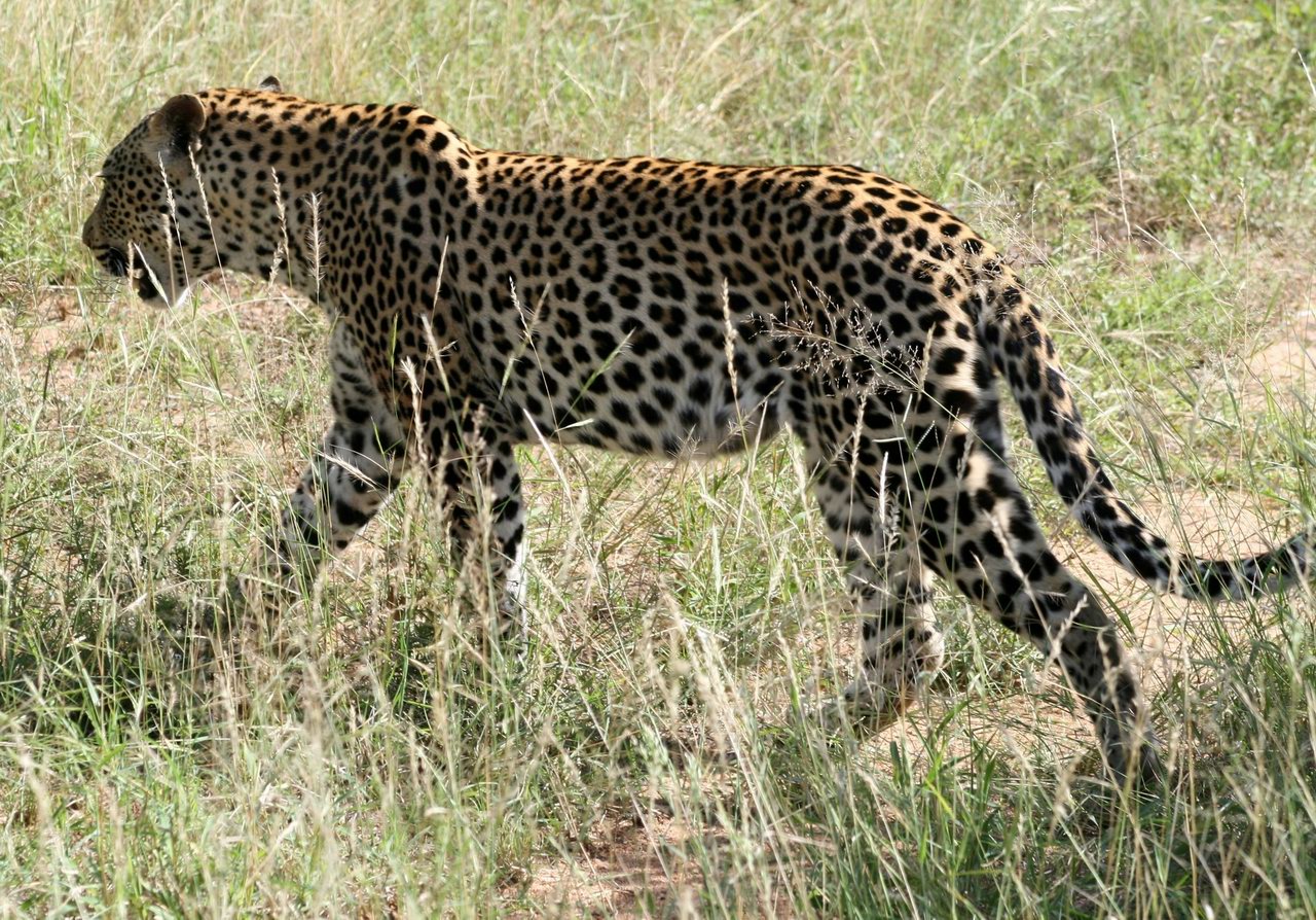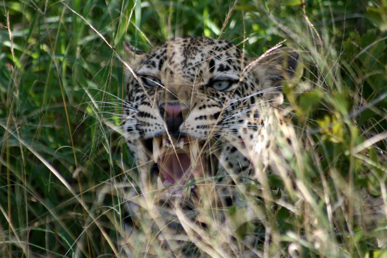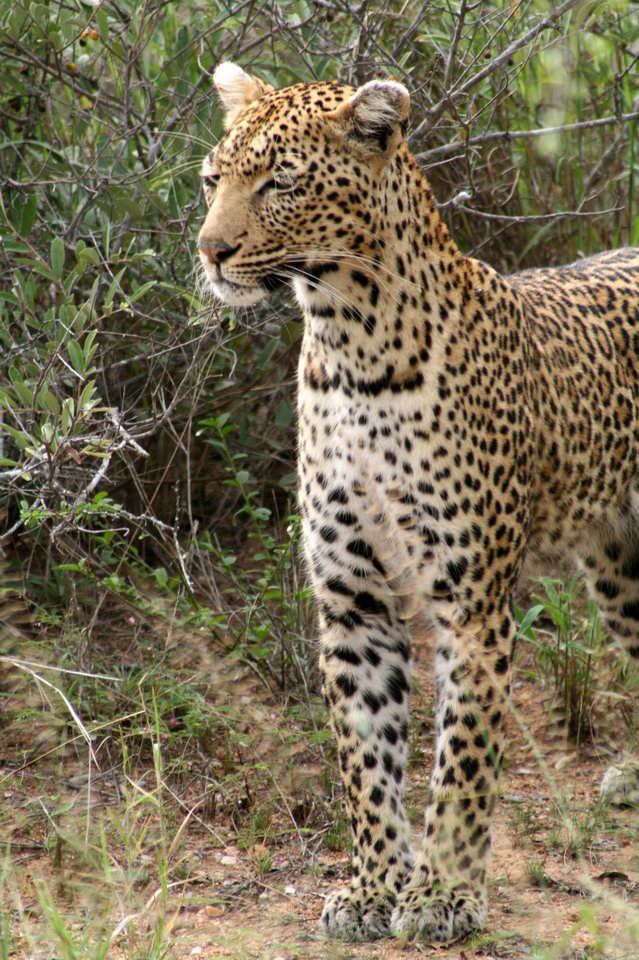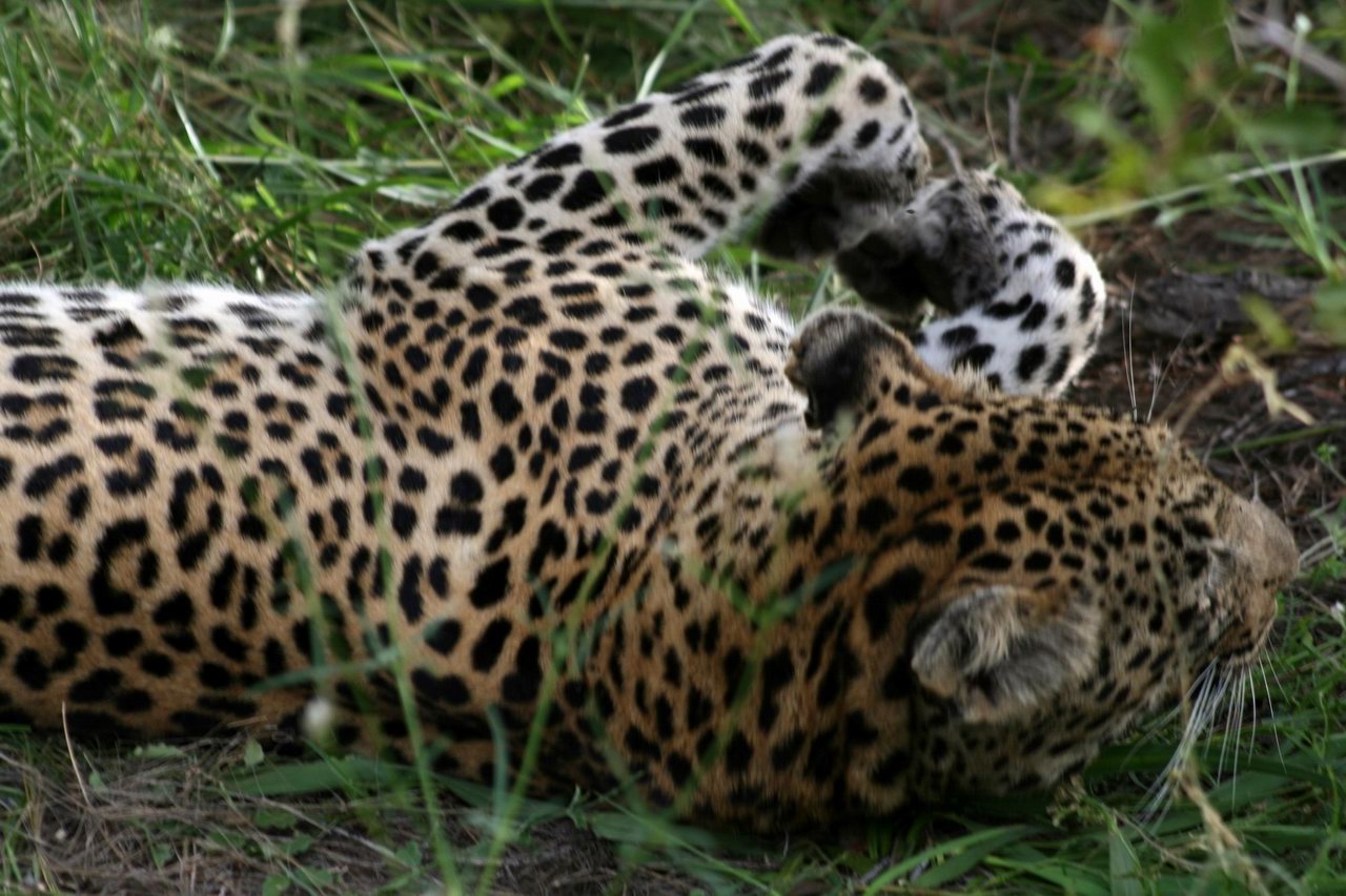 | The next day was windy and cool, few animals to see, but that night was a good night for hunting. That night a mother leopard and her son killed an impala and we visited them at the kill in the morning. Males usually hunt alone after 1-2 years of age but this one is ~3 years old and still with his mother. Not docile like the stay-at-home human male, he was very aggressively protecting his kill, hissing and growling at us and standing up suddenly to approach the vehicle, from a distance of just 5 metres, telling us to back off. This was also quite alarming. The reason for his anger became obvious later in the afternoon when we returned to find Batman the dominant male leopard lounging contentedly after devouring most of the kill. He had forced the mother and son away from "their" kill, because as Big Leopard In Charge he had automatic rights to it in this territory.