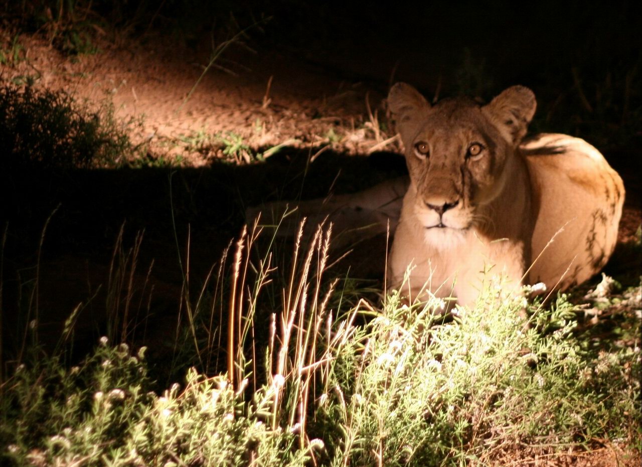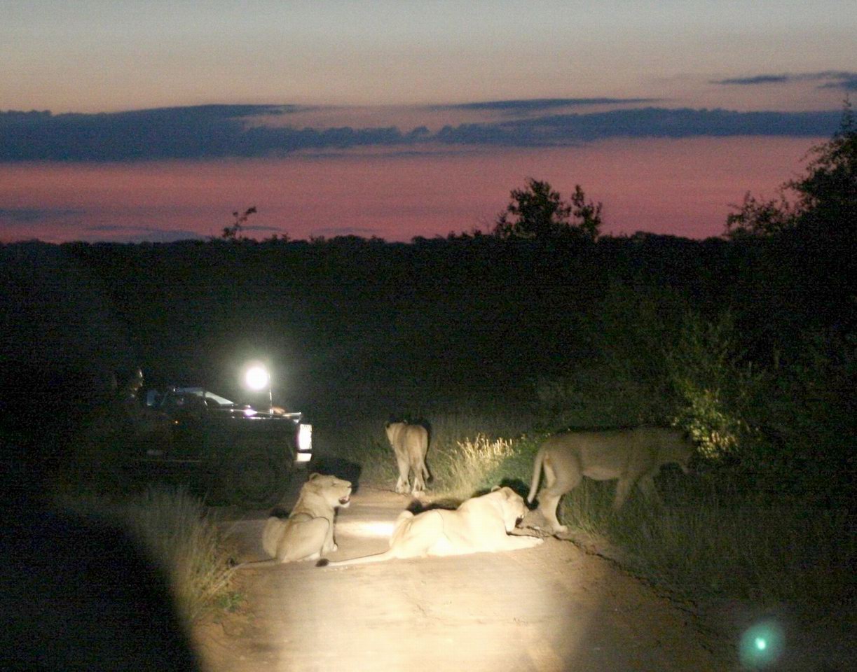 | The first night at Akeru, we got to see a pride of lions at sunset, which was exciting and then actually quite scary when they got up to go hunt and walked past us in the Land Rover - so close that Diana could have reached out and touched two of them as they passed by. For a moment I had visions of these being the last pictures in the camera when they found our half-digested bodies... But that is overly dramatic. The animals in the game park seem to see the Land Rover as a type of large and noisy animal, too large to hunt but not dangerous to them, and generally ignore it. The only risk is if you stand up or leave the vehicle, because then you are seen separately from it and might be a tasty snack. For this reason the trackers come back from their exposed front seat to sit with the rest of us when we are looking at leopards.