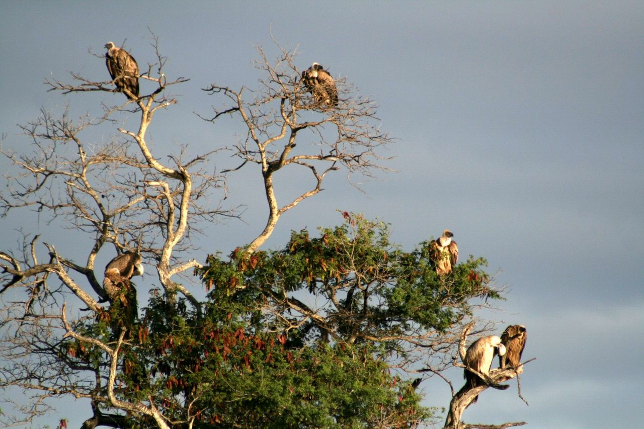 | This behavior also happens with lions, and the Big Guy with the mane rarely actually hunts himself, just takes over the kills made by the female lions. (You should hear Diana's outrage at this!) That same windy night, a pride of lions had cleverly forced a herd of buffalo over a riverside cliff and made a big kill of 3 buffalo -- enough food for the 5 lions for a long time. The site was easy to find by looking for the buzzards, and once we got there, also easy to smell -- a day is plenty of time for the guts to rot and there was too much food for the lions to finish their plates. They were lolling around lazily like Dad after Thanksgiving dinner and we never did get a good look at the Big Guy's mane.