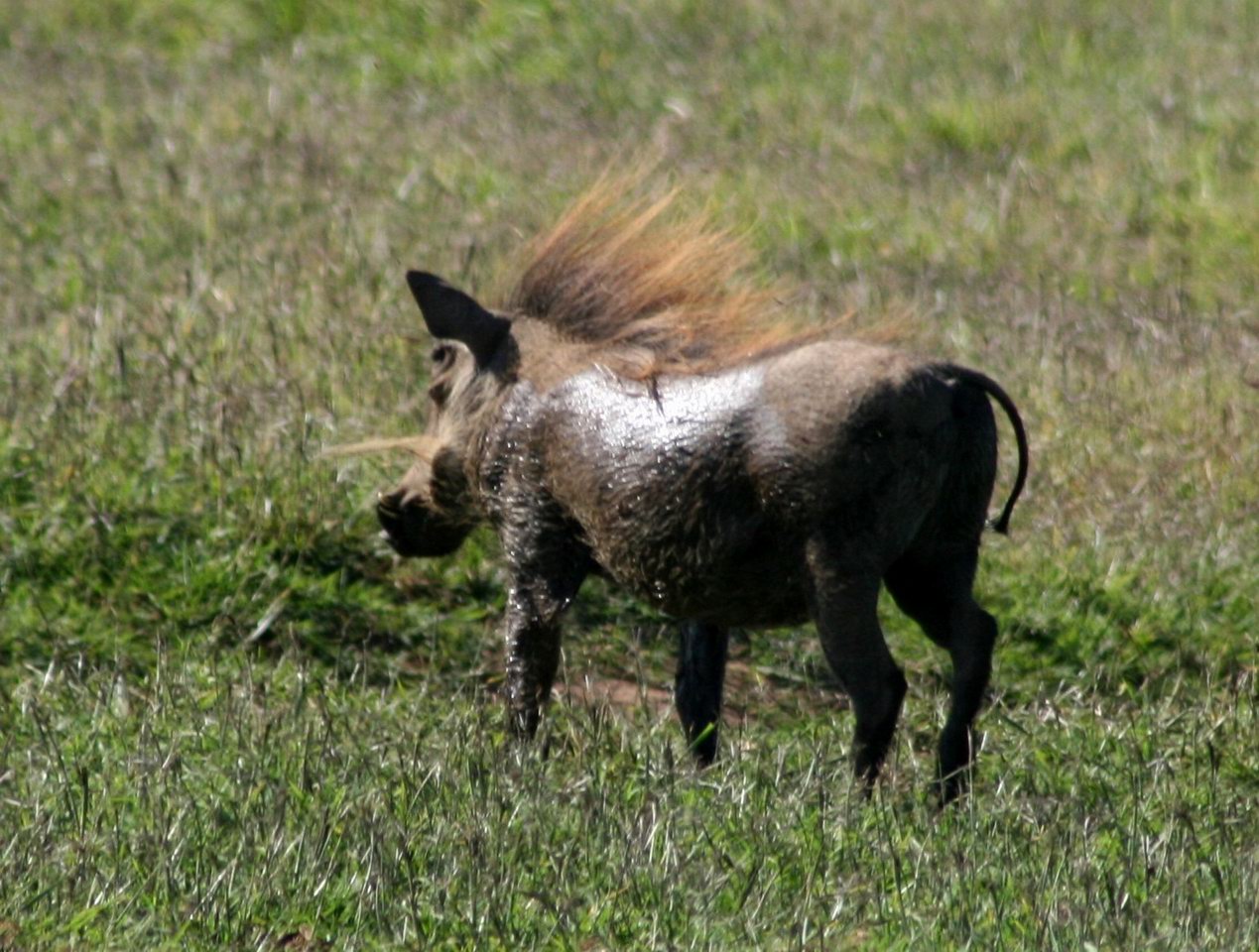 Our arrival at this water hole in the little Ford scared away the warthogs and even the birds, but this bull elephant stomped in confidently, showing us he didn't care who we were, he was taking a bath! |