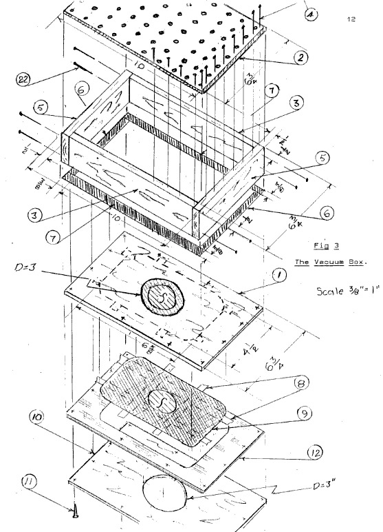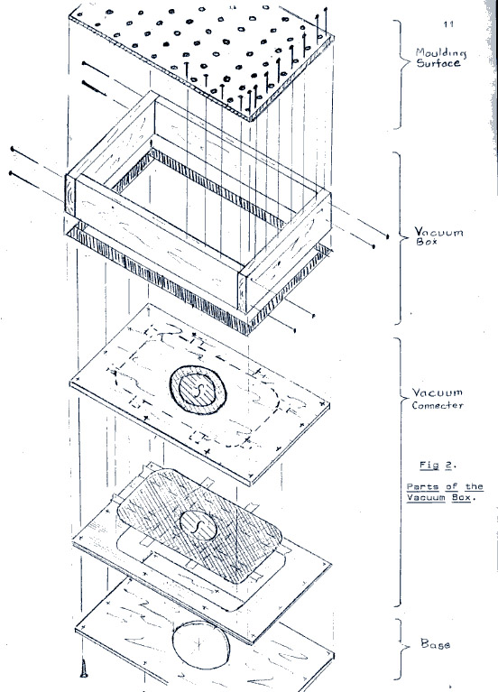 The Vacuum Box is not claimed to be entirely unique: a box is a box as a wheel is a wheel. Its principal claim to originality is: its ease of construction - no metal parts such as cake pans are necessary; the Moulding Frame with its instantly variable span, and; the Vacuum Connector.