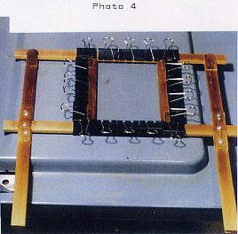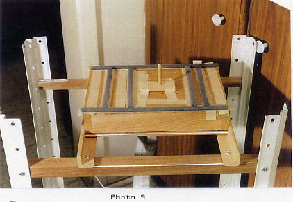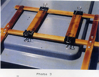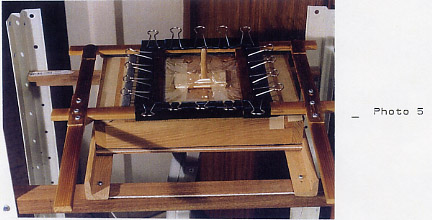 The Handle Arms are attached to the Support Arms by means of Upper Flanges A (16) and B (18) - 1/16 " Hardwood Tongue Depressors - screwed in place, and by Lower Flanges A (20) and B (21) - again Tongue Depressors or other very thin hardwoods glued in place with carpenter's glue. Tongue Depressors or the like are available in craft stores. (Or at the doctor's office provided you are sure you get your own after your exam.) Very thin pieces of wood are necessary so that the Frame with the plastic achieves an airtight fit over the mould on the Moulding Surface. The glue, after hardening, should present no problem for it is only in the heat source, the oven, for a few minutes at a time (Photo 3). However, this too should be carefully monitored.