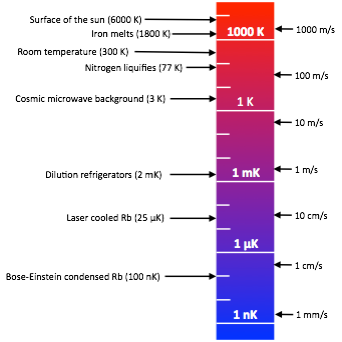 Also indicated on this scale are the average speeds of rubidium atoms (one of the most popular atoms for laser cooling), showing that the atoms moving in the condensate are moving at just millimeters per second.