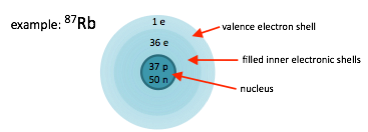 Because it’s one of the most popular atoms for laser cooling and trapping, let’s consider rubidium. The isotope with 87 nucleons has particular nice properties. It has 37 protons and 50 neutrons in the nucleus, 36 electrons in the inner electronic shells, and one valence electron.