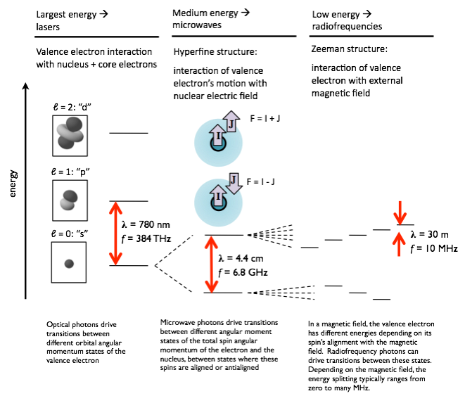 Manipulation of the internal state of the atom is easiest through the unpaired valence electron. We can use various kinds of electromagnetic fields to manipulate the different degrees of freedom of this atom, each at a different energy scale.