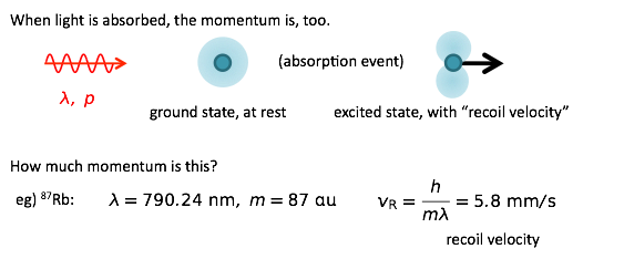 The magnitude of this velocity, ~ 6 mm/s in the case of rubidium, is on the scale of the speeds associated with the low temperatures needed to reach the quantum mechanical regime discussed earlier, and so, researchers have found ways to manipulate the motion of atoms using light, the first kind of transition discussed previously.