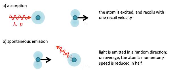 Two processes are important to consider for laser cooling. The first, absorption, excites the atoms from its ground to an excited state. The resulting motion of the atom is in the direction of the photon’s original momentum. The second process is spontaneous emission -- because of interactions with the vacuum, the atom relaxes to its ground state in about 30 ns. The photon that is expelled will do so in a random direction, giving the atom a momentum kick in the opposite direction. Because of the randomness of this process, on average, the net momentum of both these processes is half of a recoil of momentum in the direction of the original photons. When many of these absorption-emission events happen, the atom’s velocity will be tend towards the direction of the absorbing photons’.