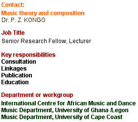 WILLIE ANKU is chair of the music department at the University of Ghana, Legon. His research insert is in theory and structural analysis of African traditional music. He was a visiting professor of California State University, San Macros. He is the author of Structural Set Analysis of African Music , vol. 1 and 2 (1992-1993).
