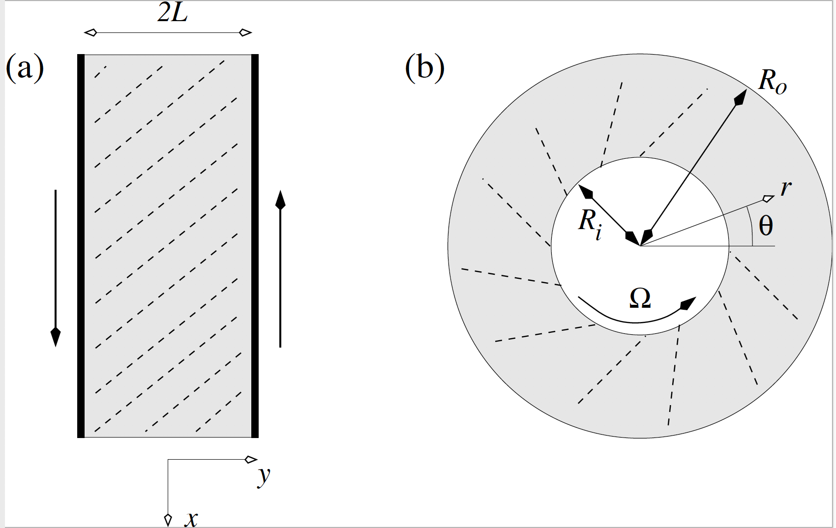 Plan view of shear-driven buckling in a rectilinear and axisymmetric channel. |