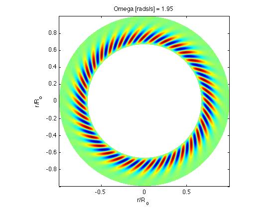 Numerial results from solving the linearized "fluidic" Foppl-von Karman equation. The inner circular boundary is assumed to rotate in the anti-clockwise direction at a fixed speed whereas the outer boundary is fixed. |