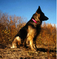 German Shepherds are playful and inquisitive. Since they are athletic and agile, they can climb or jump onto or over various objects or barriers. Given a little time, they frequently problem solve tricky situations. Although willing to be obedience trained, they do not follow commands blindly. Here is "Luke" a hefty 120 pound male at 3 years of age who was the runt of the "E" litter. |