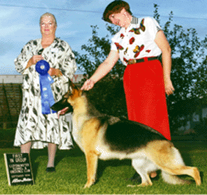 Echo was bred 4 times with 3 litters born in the month of January: 1996, 1997, and 1998. Her last litter was born August, 1999. The "D" litter (born January 14, 1996) was sired by Sel Am CH Ken Delaine's Taylor Made OFA H&E, ROM. Two females out of this litter were shown: Can CH Vonderbrink's Dyan OFA H&E and Vonderbrink's Duett (owned by Vivian and Cliff Stults of Edson, Alberta). Although Duett (Kindra) did not finish her championship she did some nice winning including two Best of Breed for a total of 9 points. The "E" litter ELitter.htm (born January 17, 1997) was sired by Am CH 2 x Sel Can CH Rockannand's Integra OFA/OVC (Tiger). Multi-group winner Can CH Vonderbrink's Eleganz TT was the only one of this litter with a show career. Ellie has retired and lives with Jocelyn Chue in Edmonton. The "F" litter (born January 19, 1998) was a repeat breeding with Tiger. (FLitter.htm) Four puppies from that litter earned their Canadian championships! Can CH Vonderbrink's Fraulein OFA H&E (Tess) is owned by Vivian and Cliff Stults of Edson, Alberta. Can CH Vonderbrink's Fredrich Jasper (Jasper) is owned by Kay Charboneau, Edmonton, Alberta . Can CH Vonderbrink's Friedal Am/Can CD TT is owned by Gisela Schneider of Colstrip, Montana. Multi group winner. Can CH Vonderbrink's Franziska (Brighton) is owned by Launie Millington of Cold Lake, Alberta. Echo's last litter was the "H" litter (HLitter.htm) sired by Can CH Khaskova's Midnight Marauder OFA (Jake) owned by Melva and Norman Doull of Lloydminster, SK. Puppies were born August 8, 1999. Two puppies out of that litter achieved their championships: Can CH Vonderbrink's Hester CD Hester.htm and Can Ch Vonderbrink's Heiko. Heiko.htm Three of Echo's daughters have produced litters. Can Ch Vonderbrink's Dyan OFA H&E, was bred to Am Ch & Sel Can Ch Rockannand's Integra OFA/OVC (Tiger). Puppies were born August 18, 1998. This was the "Teletubbie litter" or the "G Litter" as described in the January, 1999, German Shepherd Dog Review. One puppy from that litter achieved her championship: multi-group winner Can Ch Vonderbrink's Gretchen. Gretchen.htm Best in Show/Multigroup winning Can Ch Vonderbrink's Hester CD OFA H&E was bred to multigroup winning Can Ch Sandyhill's Jimmy Nevada OFA H&E. Puppies in the "I" litter were born December 6, 2001. I_litter.htm. Puppies in the "J" litter (a repeat breeding with Jimmy) were born March 25, 2003. J litter.htm Can Ch Vonderbrink's Fraulein OFA H&E has produced two litters. Return to Index.htm