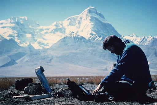Uploading MT data at site 110, elevation 4900 m. Behind is Cholmohari, a 7,400 m peak on the Tibet-Bhutan border. May 1995.